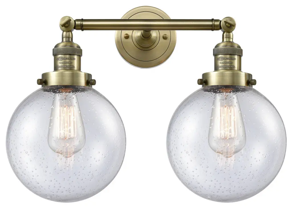 One of our largest and original collections, the Franklin Restoration is made up of a vast selection of heavy metal finishes and a large array of metal and glass shades that bring a touch of industrial into your home.Features:Solid brass 180 degree adjustable swivels with internal teeth that lock in at 5 degree intervalsFixture can be hung with bulbs facing up or down as a wall mount4.5 inch 2mm heavy cast backplateRated for 100 watt maximum per socketUL/CUL and ETL/CETL damp ratedCompatible with incandescent, LED, fluorescent and halogen bulbsNumber of Bulbs: 2Bulb Wattage: 60Bulb Type: IncandescentBulb Included: NoVoltage: 120Finish: Polished Chrome Finish Shade Finish: Seedy Shade