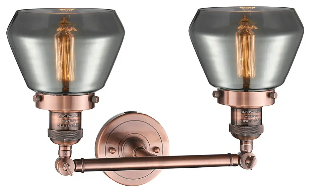 One of our largest and original collections, the Franklin Restoration is made up of a vast selection of heavy metal finishes and a large array of metal and glass shades that bring a touch of industrial into your home.Features:Solid brass 180 degree adjustable swivels with internal teeth that lock in at 5 degree intervalsFixture can be hung with bulbs facing up or down as a wall mount4.5 inch 2mm heavy cast backplateRated for 100 watt maximum per socketUL/CUL and ETL/CETL damp ratedCompatible with incandescent, LED, fluorescent and halogen bulbsNumber of Bulbs: 2Bulb Wattage: 60Bulb Type: IncandescentBulb Included: NoVoltage: 120Finish: Antique Copper Finish Shade Finish: Plated Smoke Shade.
