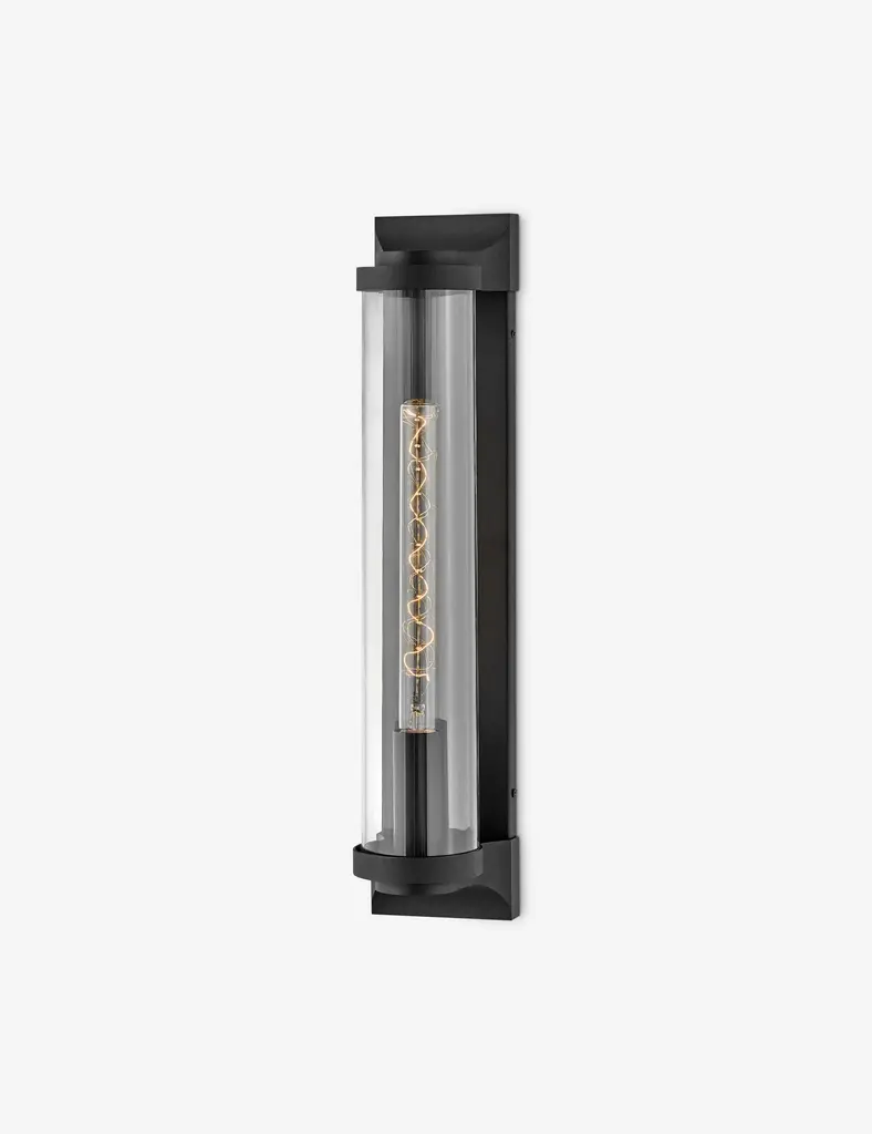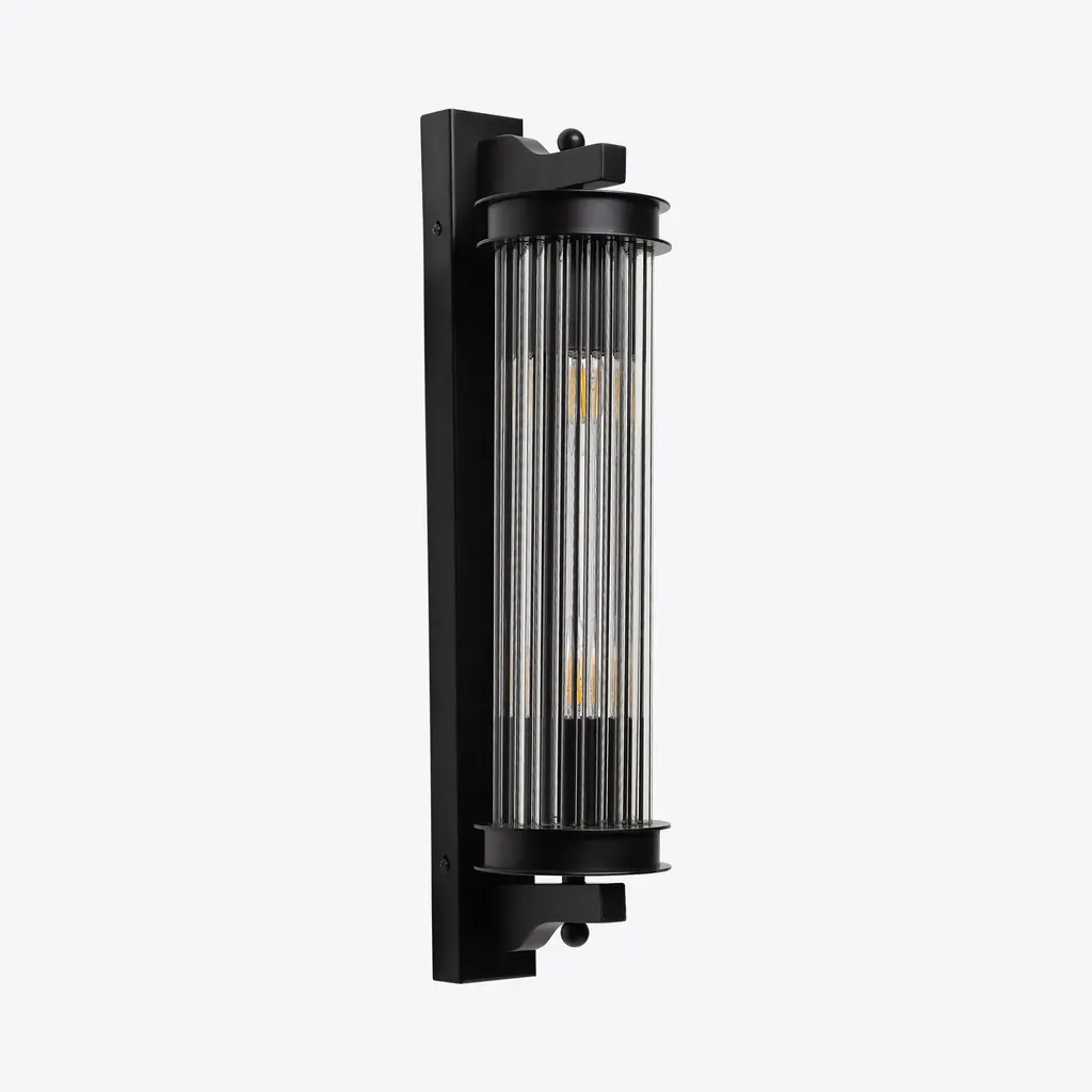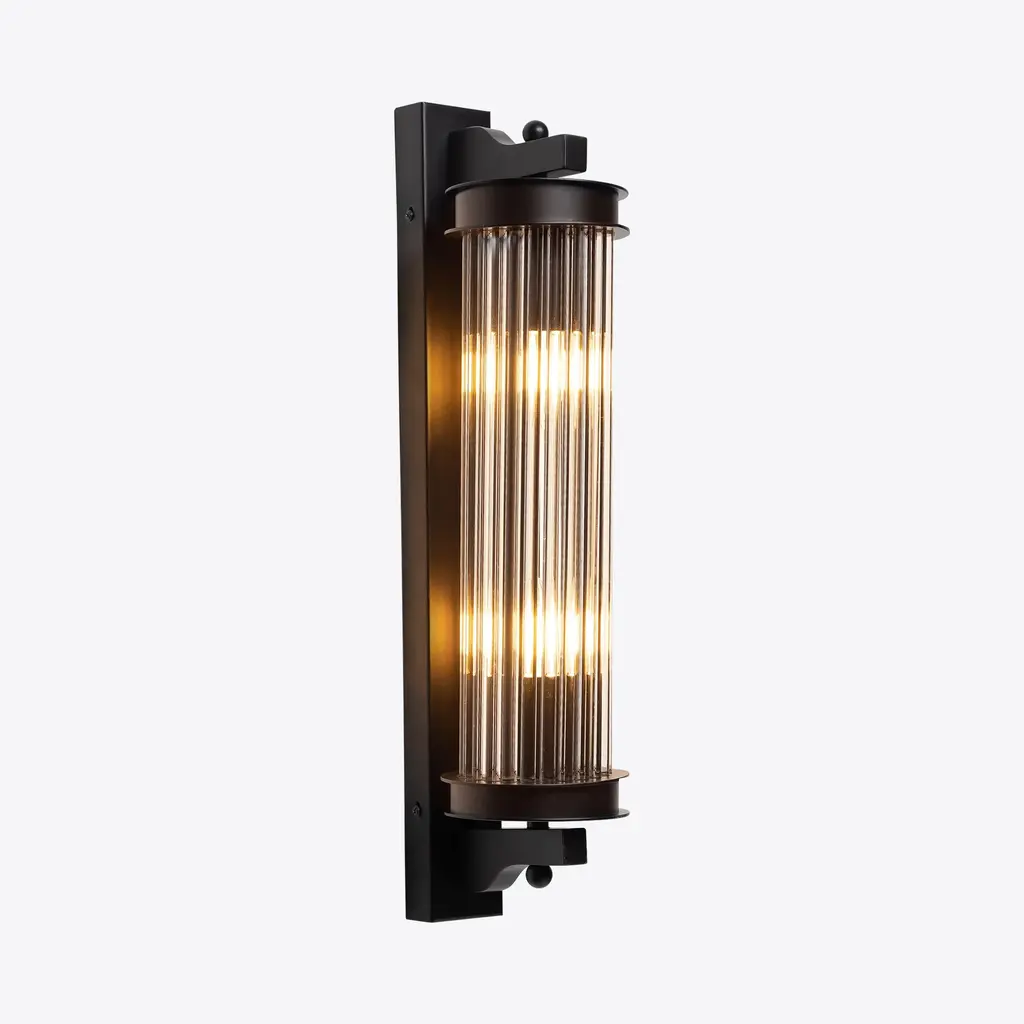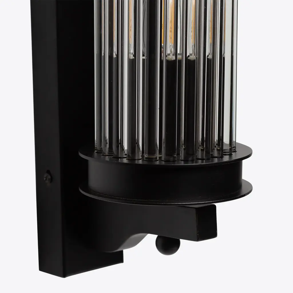 The Elon wall light is an Art Deco inspired wall sconce formed from rods of clear glass held within a symmetrical black frame. This versatile light is perfect for hallways and living areas. Numbered, Up to 250V (Europe/UK Standard).