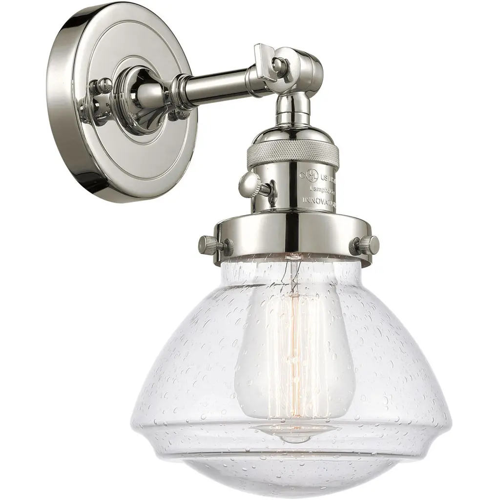 One of our largest and original collections, the Franklin Restoration is made up of a vast selection of heavy metal finishes and a large array of metal and glass shades that bring a touch of industrial into your home.Features:Solid brass 180 degree adjustable swivel with internal teeth that lock in at 5 degree intervals, and engraved cast cup3 way (High-Low-Off) switch included on socketFixture can be hung with bulbs facing up or down as a wall mount, or facing down as a ceiling mountDistance from outlet opening to top of fixture 2.25 inchRated for 100 watt maximumUL/CUL and ETL/CETL damp ratedCompatible with incandescent, LED, fluorescent and halogen bulbsNumber of Bulbs: 1Bulb Wattage: 60Bulb Type: IncandescentBulb Included: NoVoltage: 120Finish: Polished Chrome Finish Shade Finish: Seedy Shade.
