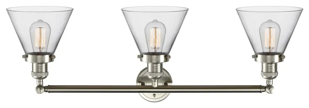 Large Cone 3-Light Bath Fixture, Clear Glass, Satin Brush Nickel