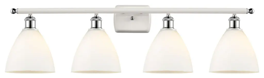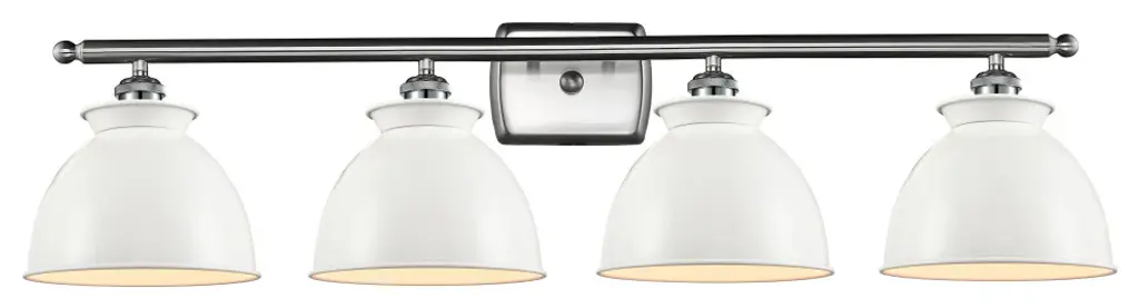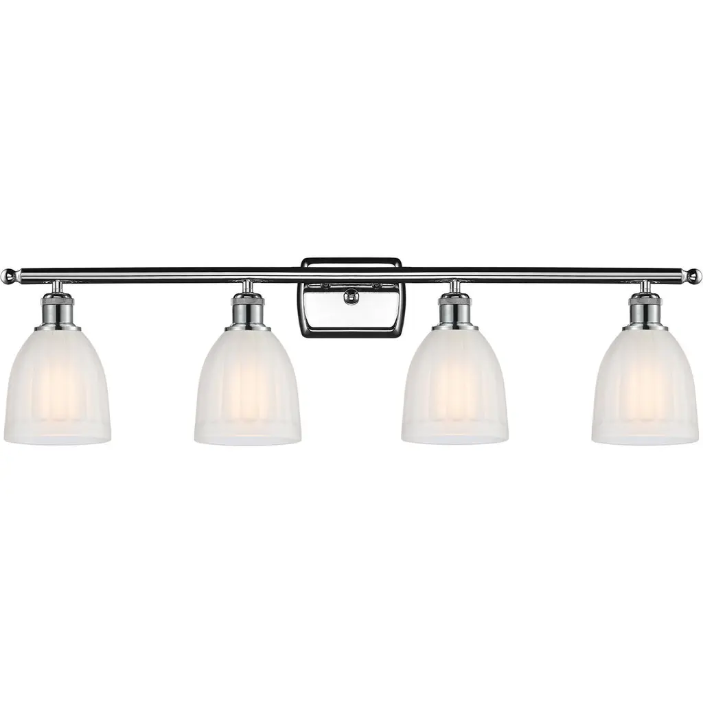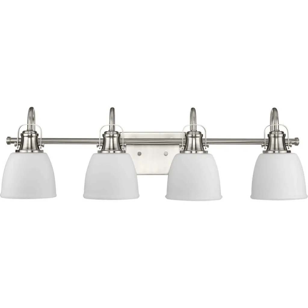 One of our largest and original collections, the Franklin Restoration is made up of a vast selection of heavy metal finishes and a large array of metal and glass shades that bring a touch of industrial into your home.Features:Solid brass 180 degree adjustable swivels with internal teeth that lock in at 5 degree intervals with engraved cast cupRated for 100 watt maximum per socketUL/CUL Damp RatedCompatible with Incandescent, LED, Fluorescent and Halogen bulbsNumber of Bulbs: 4Bulb Wattage: 60Bulb Type: IncandescentBulb Included: Not IncludedVoltage: 120Finish: Polished Chrome Finish Shade Finish: Matte White Shade.