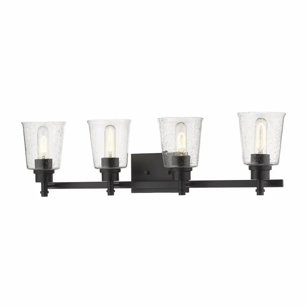 One of our largest and original collections, the Franklin Restoration is made up of a vast selection of heavy metal finishes and a large array of metal and glass shades that bring a touch of industrial into your home.Features:Solid brass 180 degree adjustable swivels with internal teeth that lock in at 5 degree intervals with engraved cast cupRated for 100 watt maximum per socketUL/CUL Damp RatedCompatible with Incandescent, LED, Fluorescent and Halogen bulbsNumber of Bulbs: 4Bulb Wattage: 60Bulb Type: IncandescentBulb Included: Not IncludedVoltage: 120Finish: Black Antique Brass Finish Shade Finish: Seedy Shade