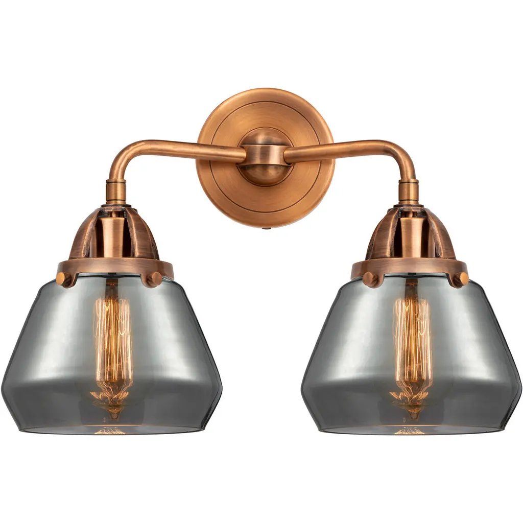 The Nouveau 2 is a highly detailed work of art that draws the eyes into its base and arm detail. The true show stopping piece is the beautifully curved glass shade that''s sure to wow you and guests alike.Features:Fixture can be hung with bulbs facing up or down4.5 inch 2mm heavy cast backplateDistance from outlet opening to top of fixture 2.25 inchesRated for 100 watt maximum per socketUL/CUL Damp RatedCompatible with Incandescent, LED, Fluorescent and Halogen bulbsNumber of Bulbs: 2Bulb Wattage: 3.5Bulb Type: LEDBulb Included: IncludedVoltage: 120Finish: Antique Copper, Plated Smoke