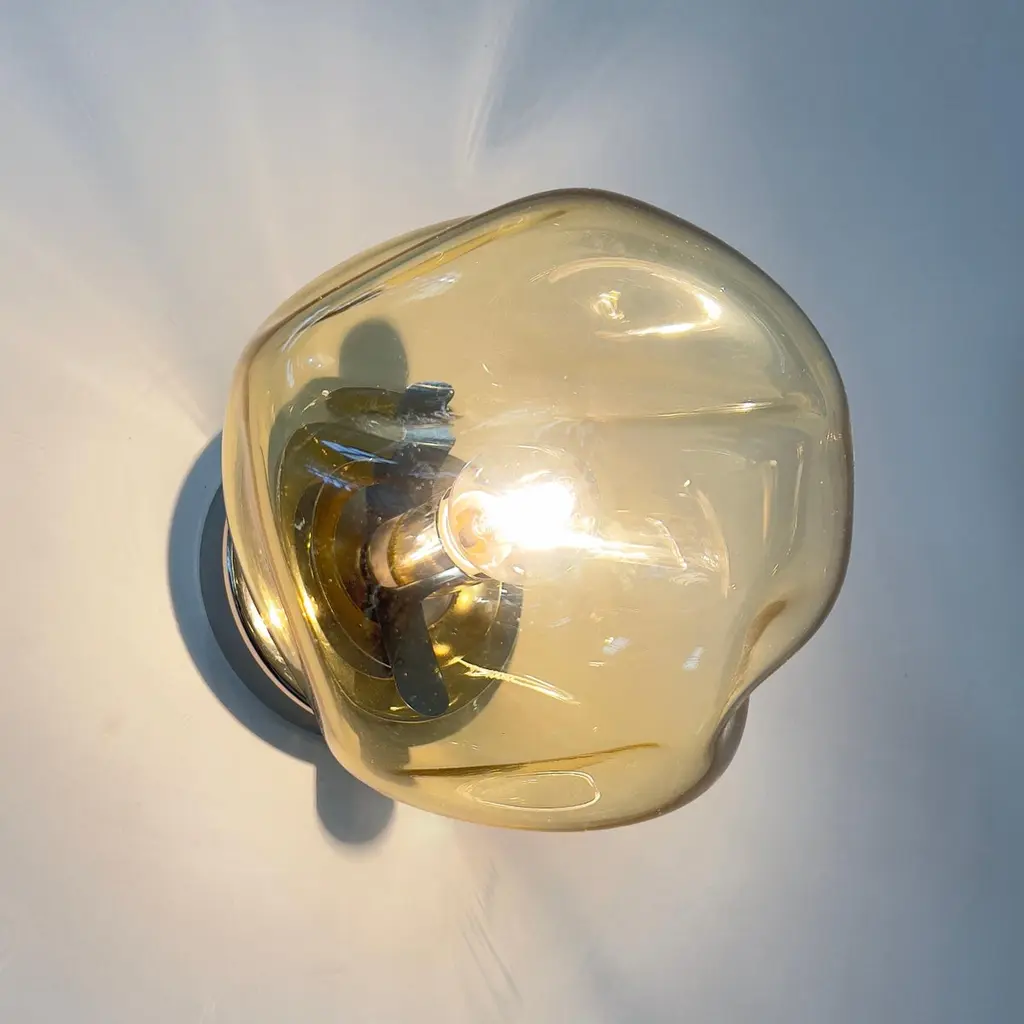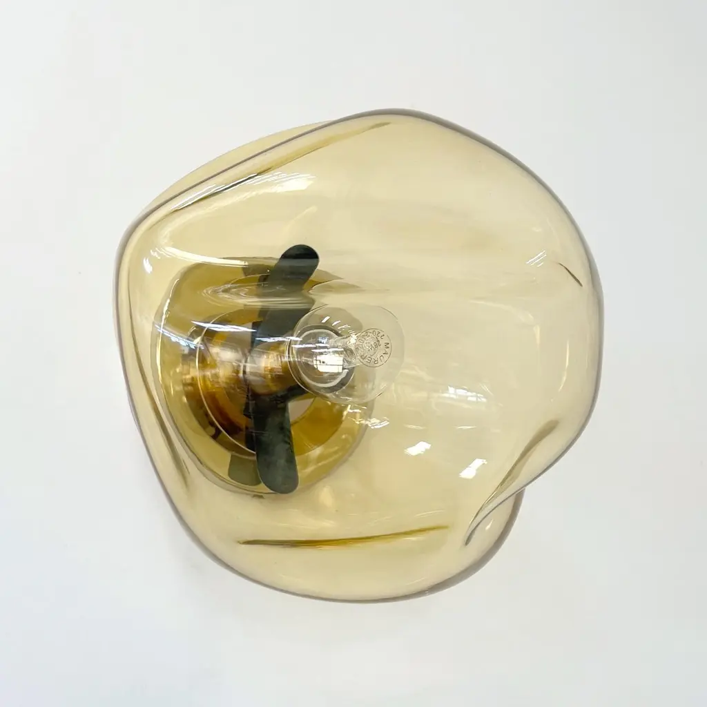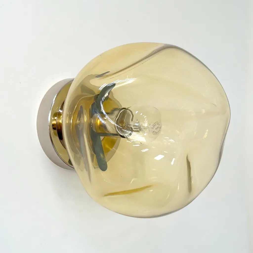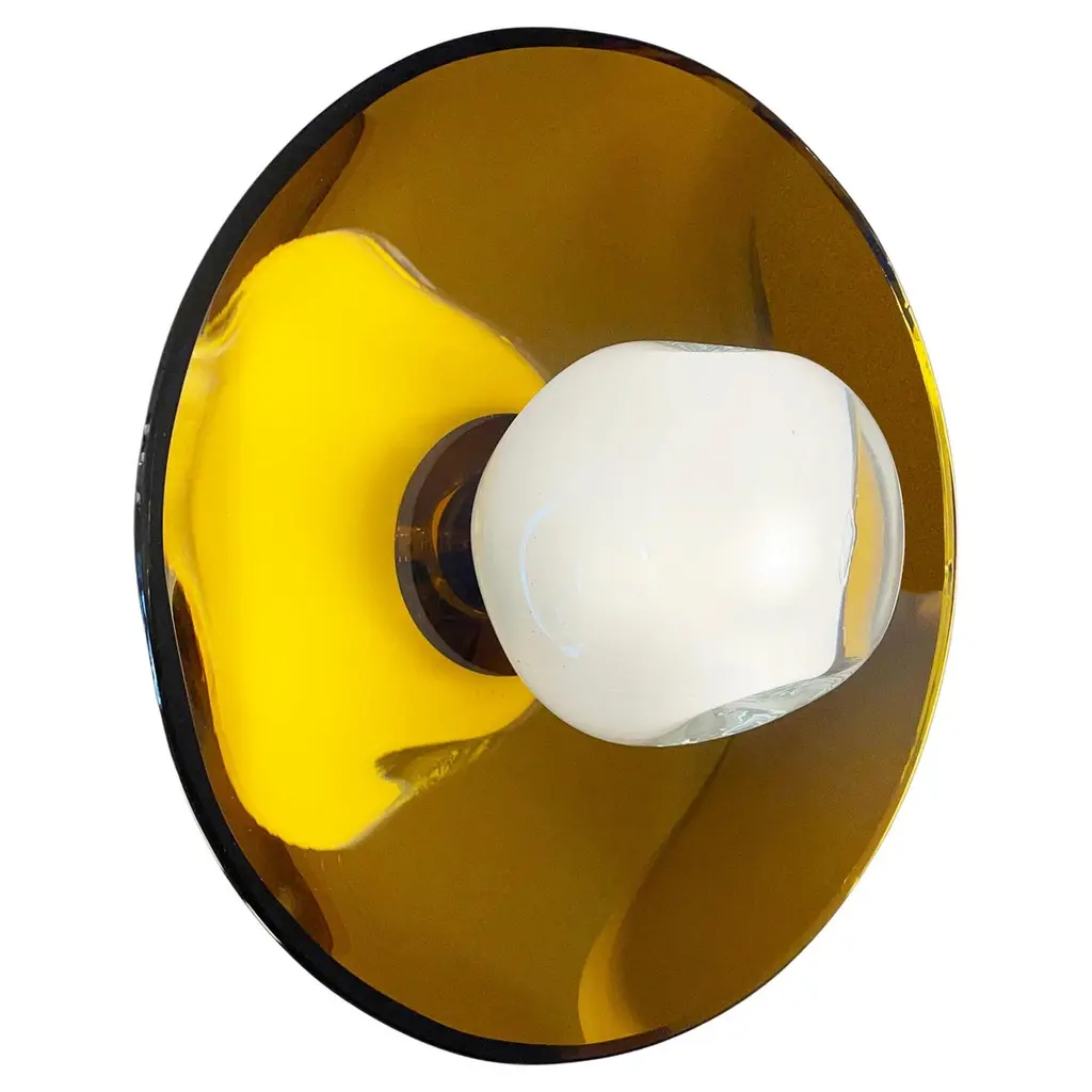 Italian modern wall light or flush mount with a large amber warped Murano glass shade mounted on polished nickel finish metal frame, designed by Fabio Bergomi for Fabio Ltd, made in Italy1 light / E12 or E14 type / max 40WMeasures: Height 7 inches, width 8 inches, depth 9 inchesOrder only / This item ships from ItalyPlease inquire for custom options / pricing / current lead timesOrder Reference #: FABIOLTD W618
