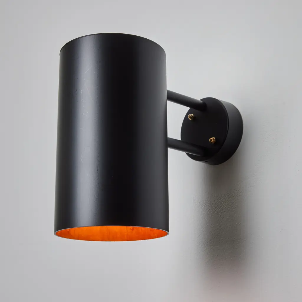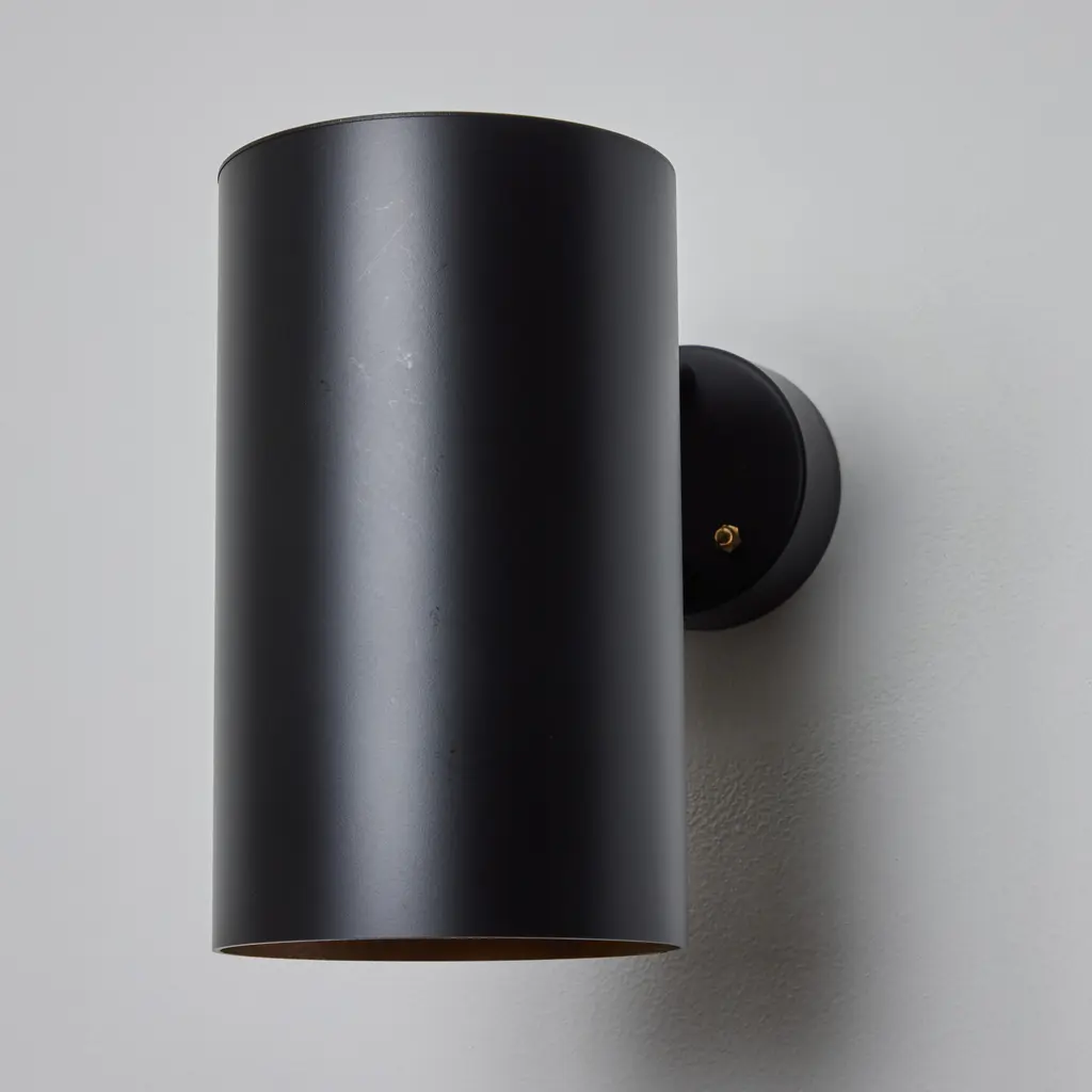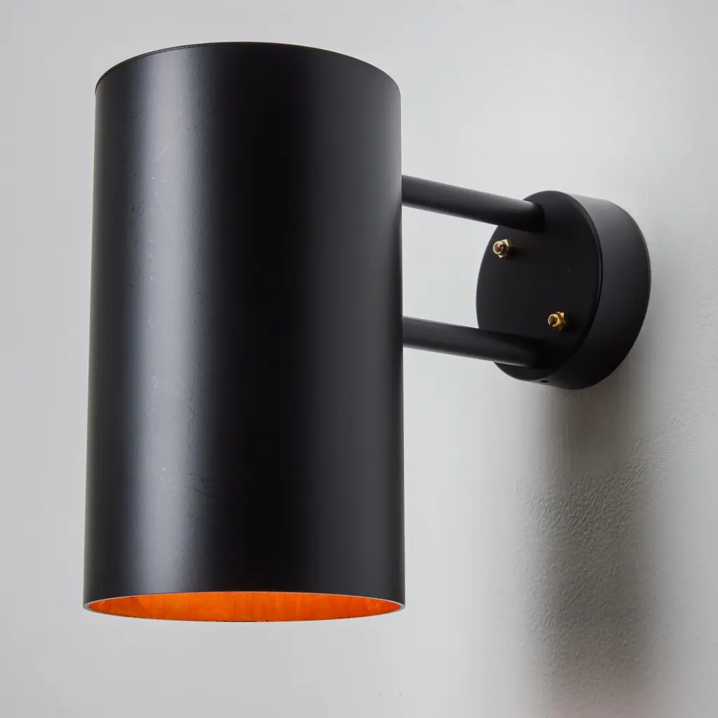 Large Hans-Agne Jakobsson C 627 'Rulle' outdoor sconces in black - a pair. An exclusive made for U.S. and UL listed authorized re-edition of the classic Swedish design executed in black painted metal with a raw metal interior. An incredibly refined design that is quintessentially Scandinavian. Available in raw brass, raw copper, verdigris, darkly patinated, dark brown patinated, and white or black painted metal. Also available in smaller Size. This listing is for the large black painted variant. Price is per pair. Available in unlimited quantities in choice of raw brass, raw copper, verdigris, darkly patinated verdigris, dark brown patinated, and white or black painted metal. Several raw copper & brass lamps in-stock and ready to quick ship. Patinated and painted variants are made to order in approximately 2-3 weeks, but can be expedited for an additional fee. Please note that in-stock inventory availability can change at any time. For time-sensitive orders, kindly inquire prior to purchasing. All sales are final. Authorized re-edition newly produced by Orsjo, Sweden. Professionally wired for US electrical. For indoor or outdoor use. Hardwires to a US junction box. Accommodates a single standard medium base 100W equivalent LED bulb (or 60W incandescent). UL listed. Note that only one representative example is shown in the listing images. Patina of the raw metal interior can vary from lamp to lamp. Made to order.