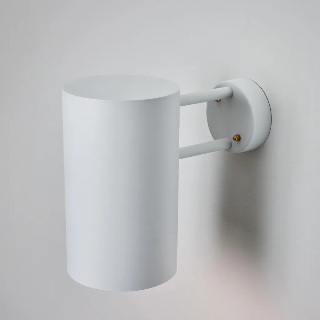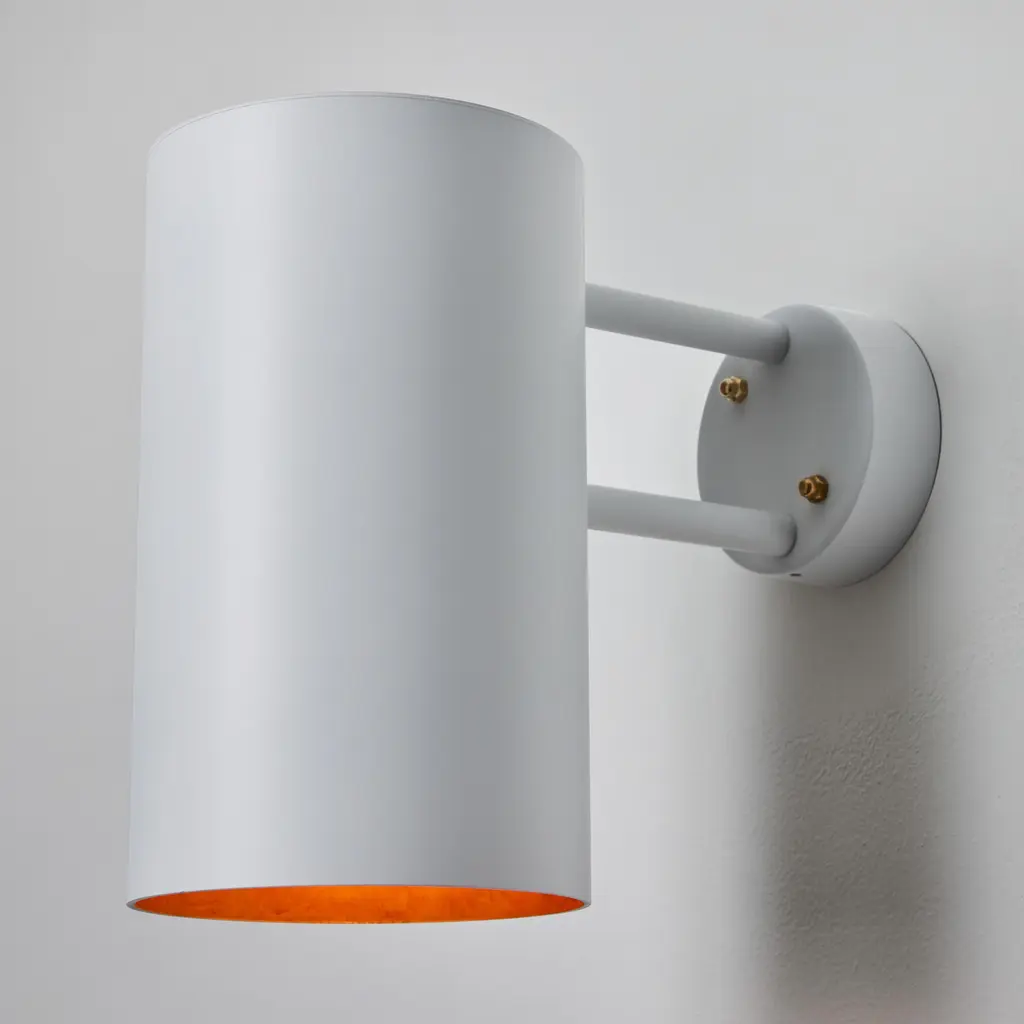 Large Hans-Agne Jakobsson C 627 'Rulle' outdoor sconces in white - a pair. An exclusive made for U.S. and UL listed authorized re-edition of the classic Swedish design executed in white painted metal with a raw unlacquered metal interior. An incredibly refined design that is quintessentially Scandinavian. Available in raw brass, raw copper, verdigris, darkly patinated, dark brown patinated, and white or black painted metal. Also available in smaller size. This listing is for the large white painted variant. Price is per pair. Available in unlimited quantities in choice of raw brass, raw copper, verdigris, darkly patinated verdigris, dark brown patinated, and white or black painted metal. Several raw copper & brass lamps in-stock and ready to quick ship. Patinated and painted variants are made to order in approximately 2-3 weeks, but can be expedited for an additional fee. Please note that in-stock inventory availability can change at any time. For time-sensitive orders, kindly inquire prior to purchasing. All sales are final. Authorized re-edition newly produced by Orsjo, Sweden. Professionally wired for US electrical. For indoor or outdoor use. Hardwires to a US junction box. Accommodates a single standard medium base 100W equivalent LED bulb (or 60W incandescent). UL listed. Only one representative example is shown in the listing photos. Patina of the raw unlacquered metal interior can vary from lamp to lamp. Made to order.