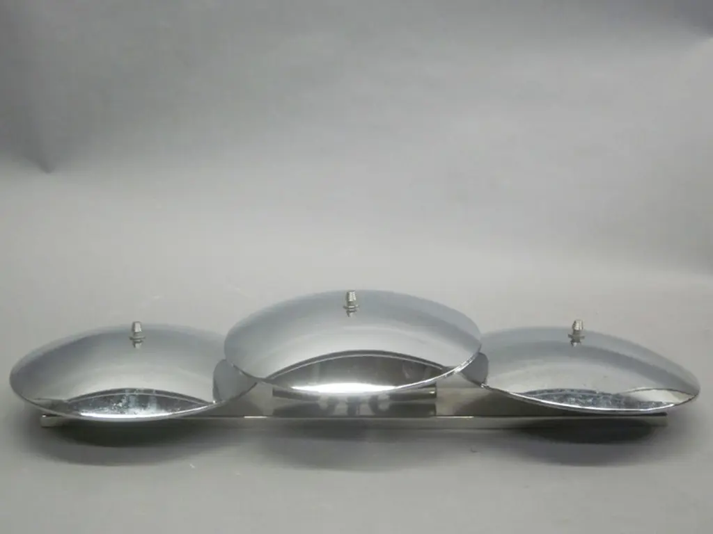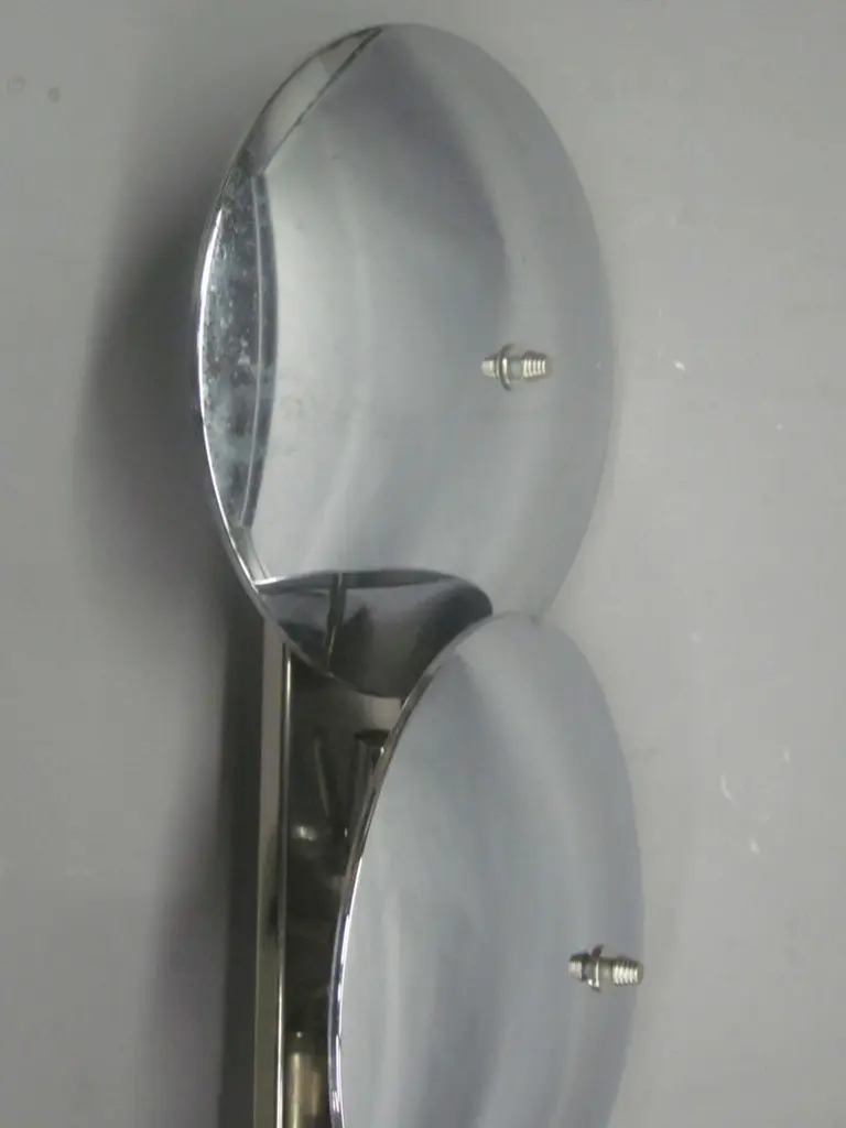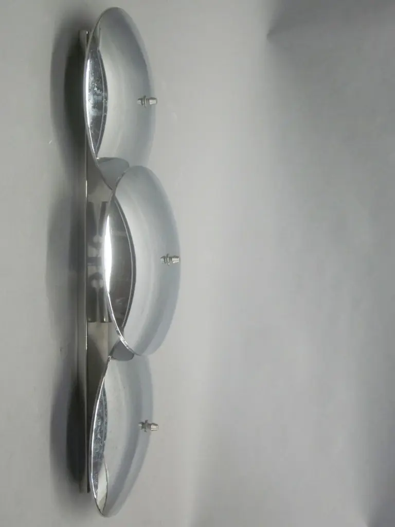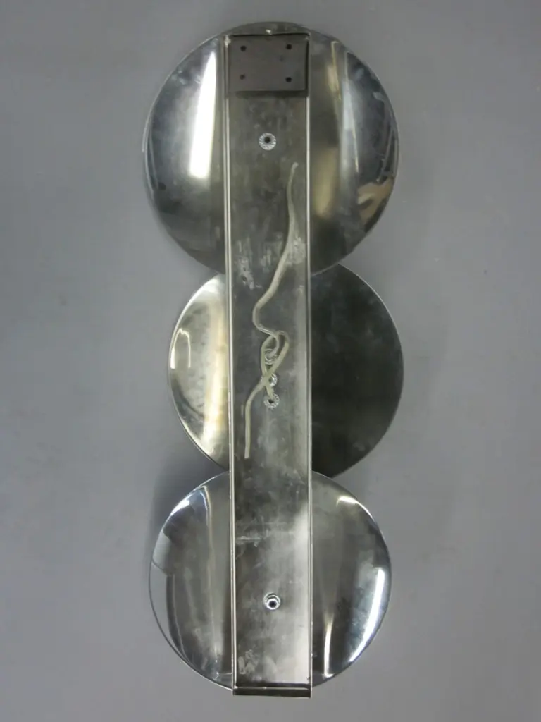 Elegant Italian Mid-Century Modern wall lights / flush mount fixtures in the form of three chromed round discs by Reggiani.These large pieces can be mounted vertically or horizontally on a wall or on a ceiling. They provide indirect, diffused, soft, environmental light to a space. 2 pieces are available. Priced and sold individually.Additional References: Arredoluce, Angelo Lelli, Arteluce, Gino Safarti.