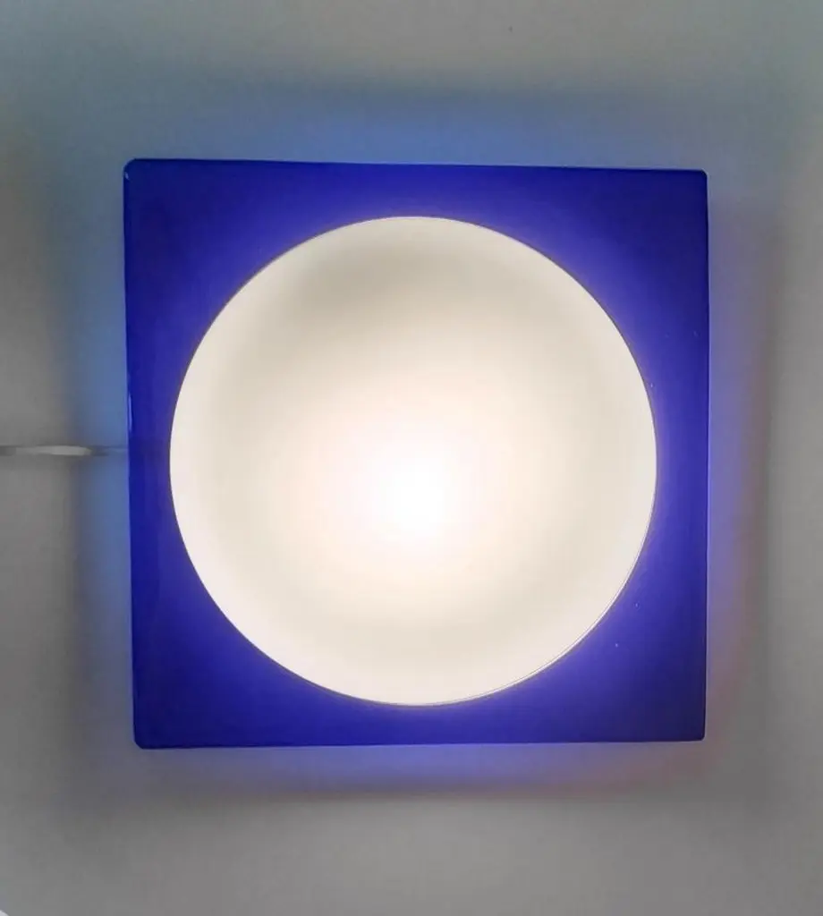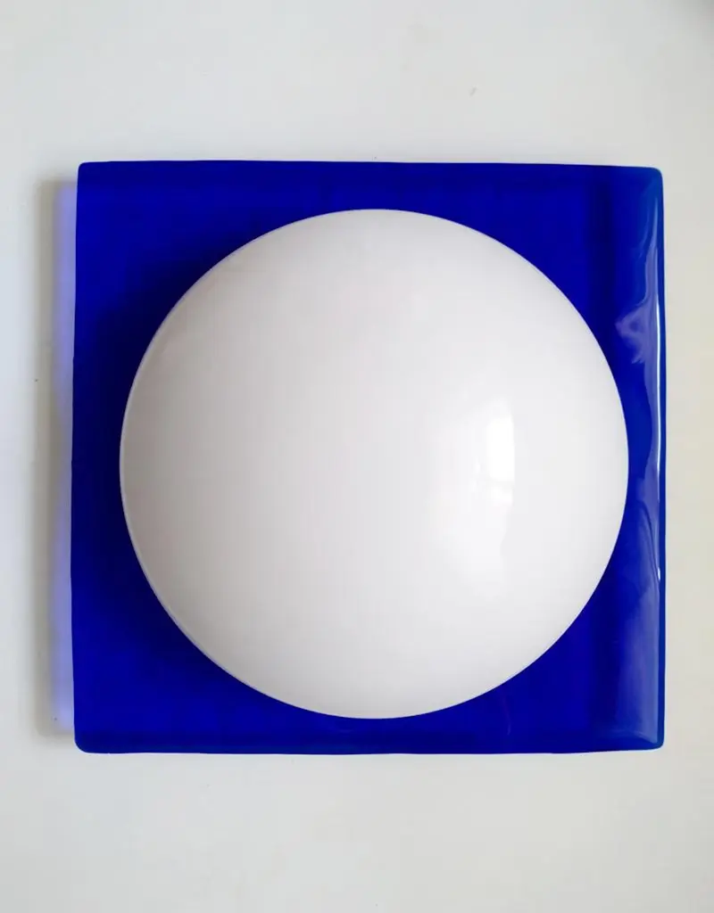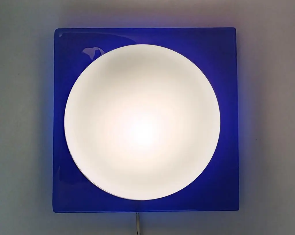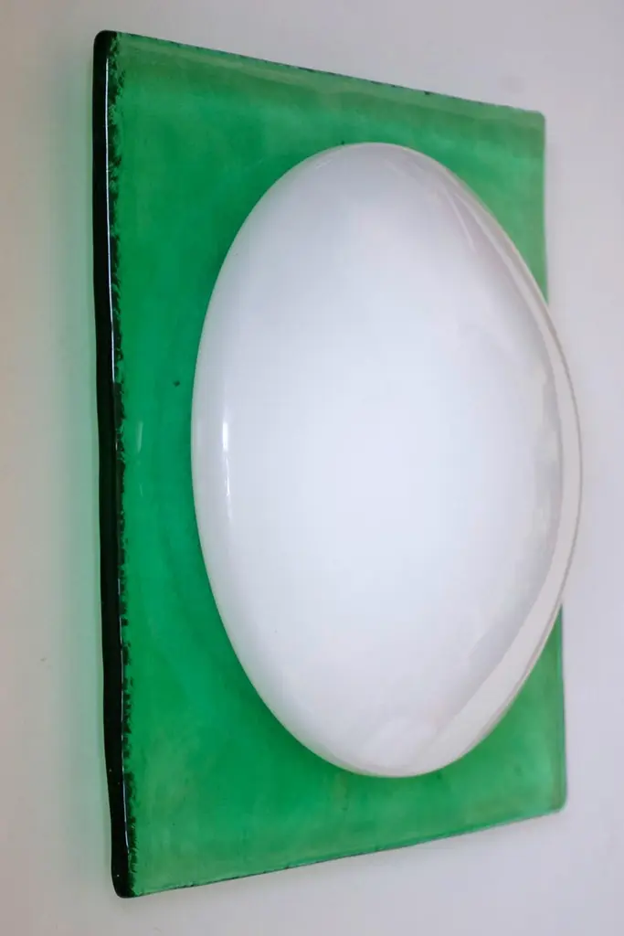 One vintage Space Age hand blown round opal white and square textured (blue or green) glass wall or ceiling flush mount.Italy, 1970s-1980s.Lamp socket: One E27 (US E26).Available: 6x Blue, 4x Green, 1x Clear