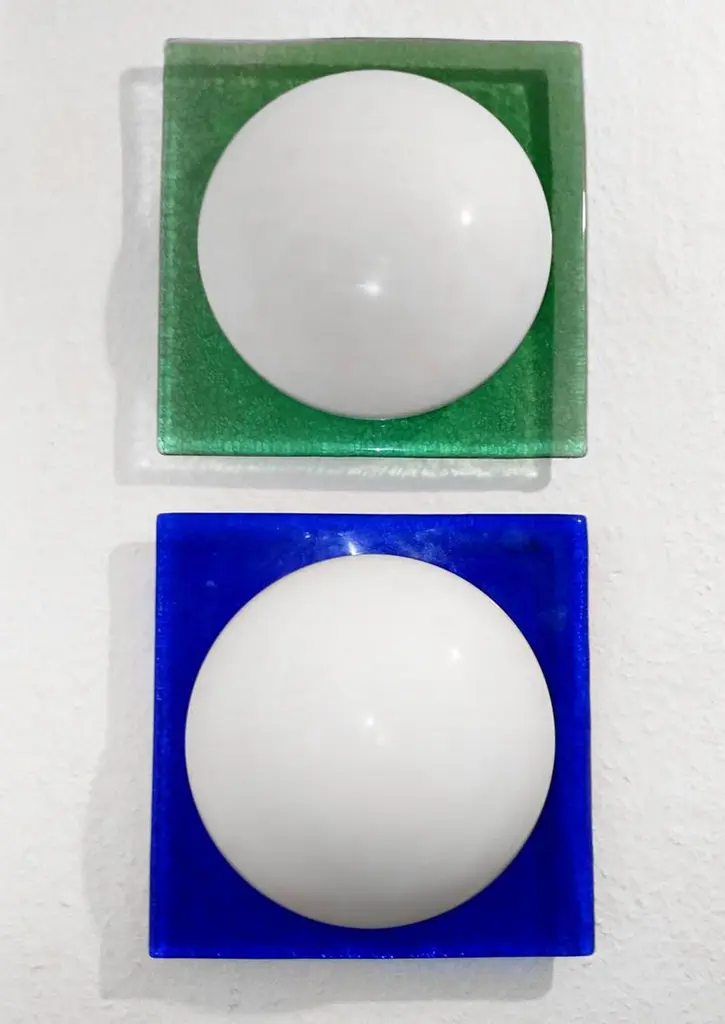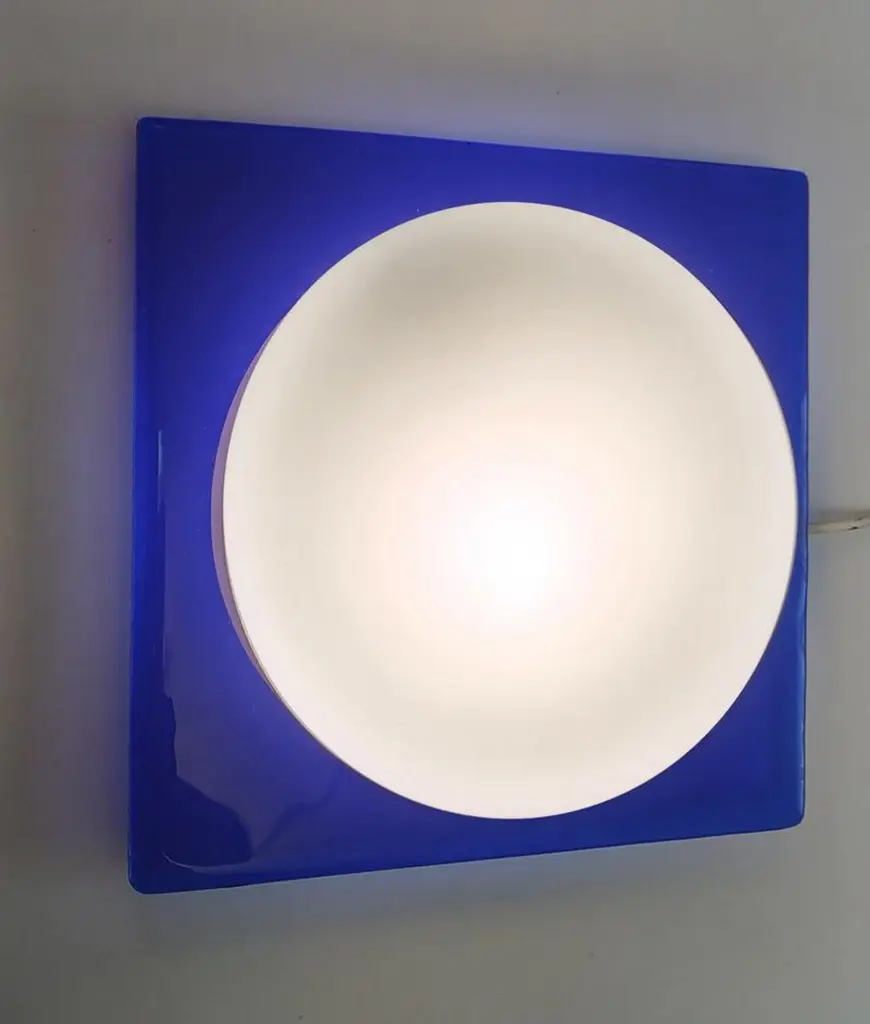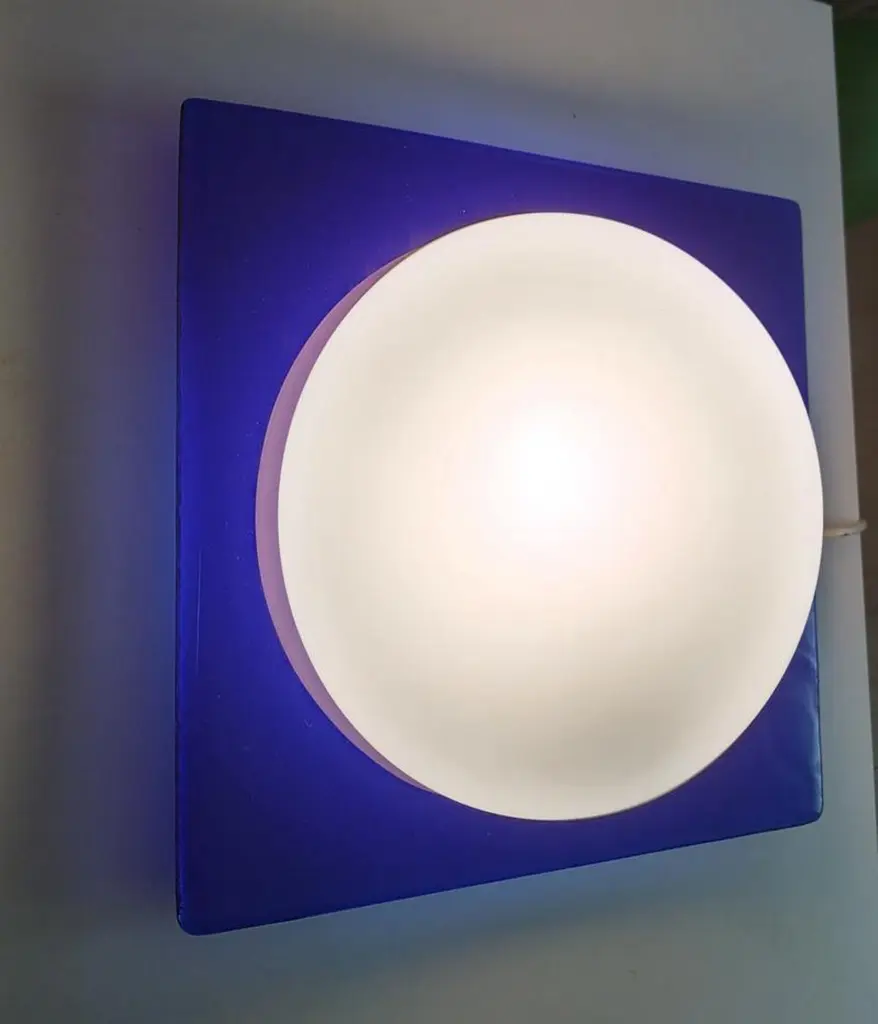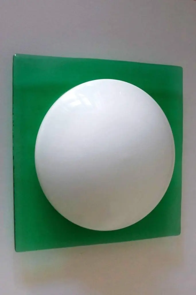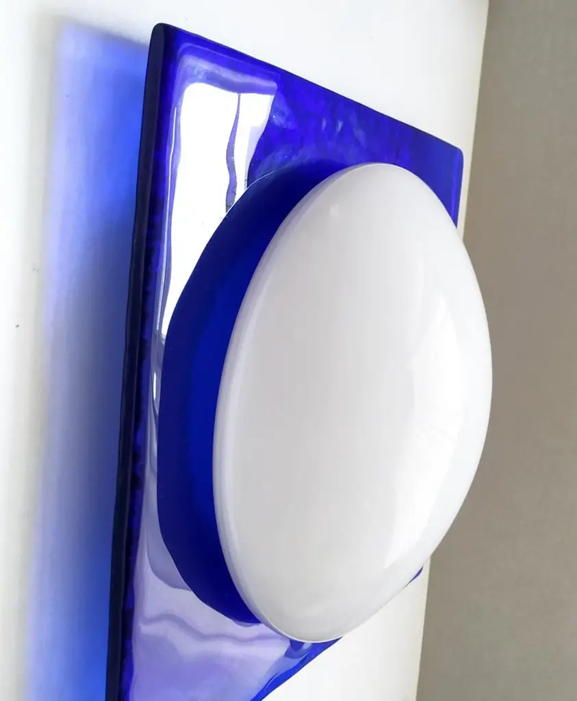 One vintage Space Age hand blown round opal white and square textured (blue or green) glass wall or ceiling flush mount.Italy, 1970s-1980s.Lamp socket: One E27 (US E26).Available: 6x Blue, 4x Green, 1x Clear