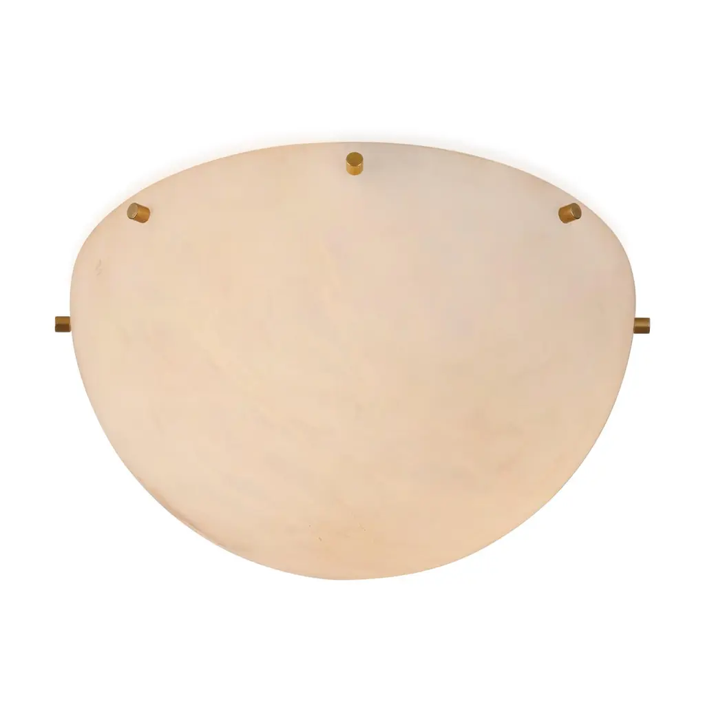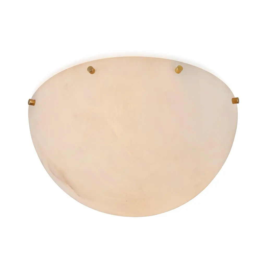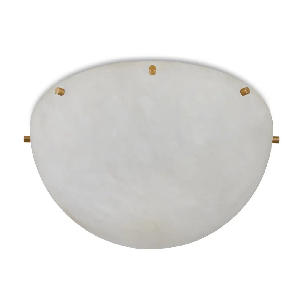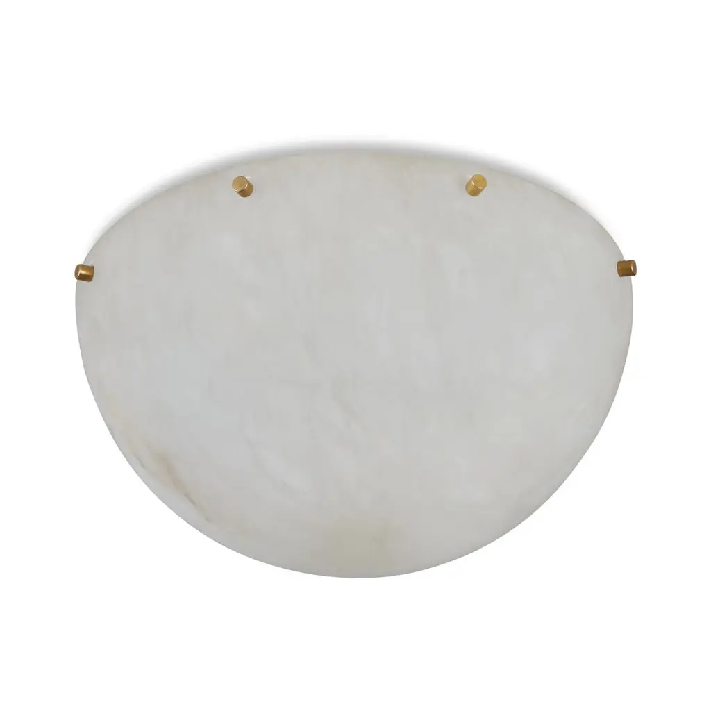 Large 'Moon 8' Alabaster Ceiling or Wall Lamp by Denis De La MesiereHandcrafted in Los Angeles in the workshop of noted French designer and antiques dealer Denis de le Mesiere, who meticulously pays homage to the work of Pierre Chareau with scrupulous attention to detail and materials. Executed in the highest quality European alabaster half-sphere mounted on a Minimalist steel bracket, this ultra refined design adds a sculptural element and focal point of incomparable beauty. Can be use as a flush mount or sconce.Accommodates 2x medium base 75W equivalent LED bulbs. LED only. UL listed.Price is per item. Available in two sizes and with 4 or 8 metal accent pieces around the outer edge. Brass, bronze or nickel hardware available; please specify finish when ordering. This listing is for the larger sized lamp with 8 accent pieces around its outer edge.Alabaster sphere measures 15" in diameter; total diameter with hardware 15.5". Custom sizes also available for an additional fee and with extended lead times possible.Please note that alabaster can vary from item to item due to the organic nature of the material.Handmade to order in Los Angeles. All sales are final.