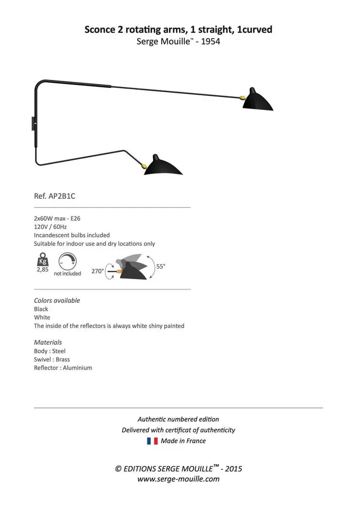 Large Serge Mouille 2-arm wall lamp with straight and curved rotating arms. Originally designed in 1953, this iconic lamp is still made by Edition Serge Mouille in France using many of the same small-scale manufacturing techniques and scrupulous attention to detail, materials and craftsmanship. Executed in two black metal independently rotating arms--one straight, one curved--with black and white painted aluminum shades and brass swivels for shade adjustability. Includes certificate of authenticity and engraved serial number. Each lamp accommodates a single medium base 60w max incandescent bulb (higher with LED). Price is per item.
