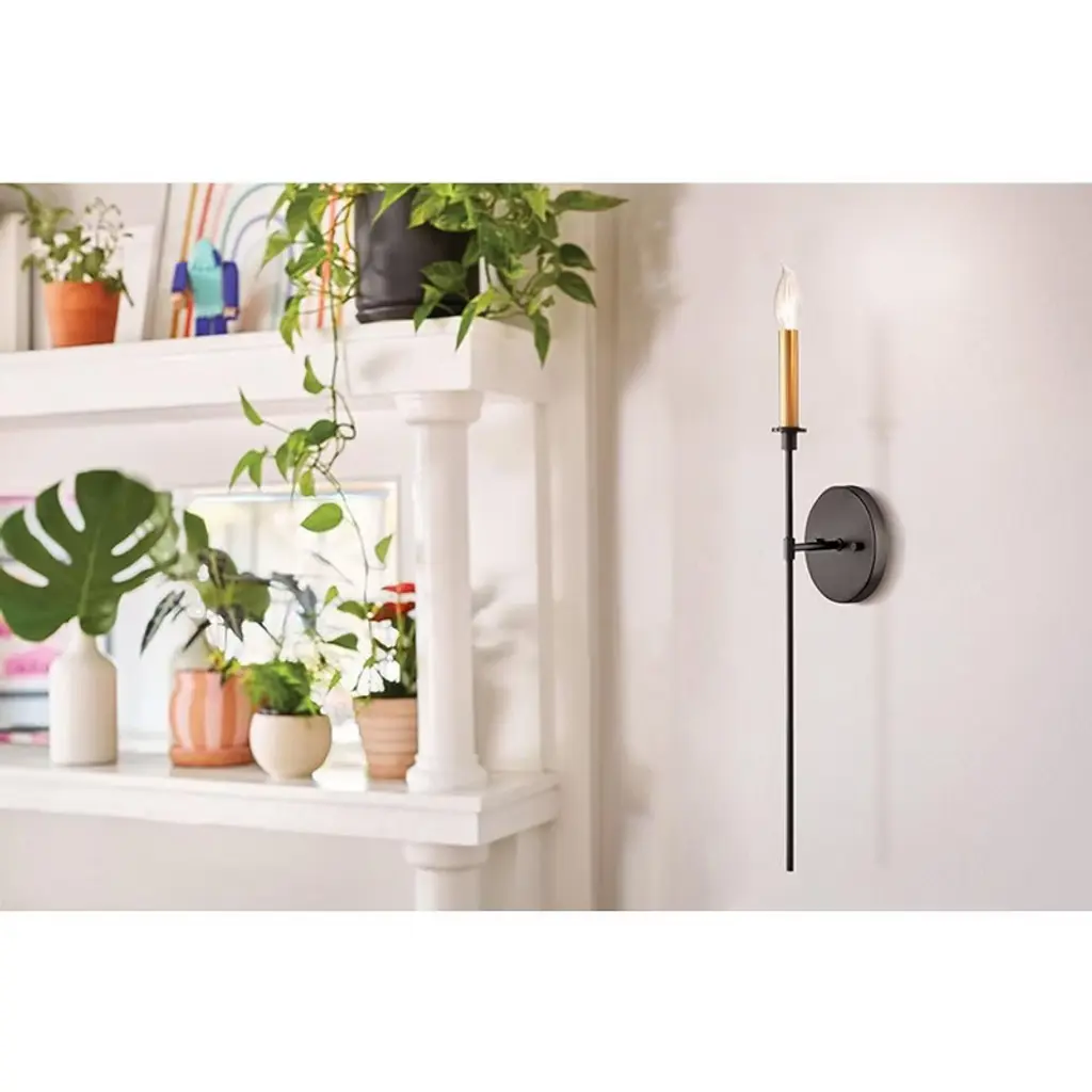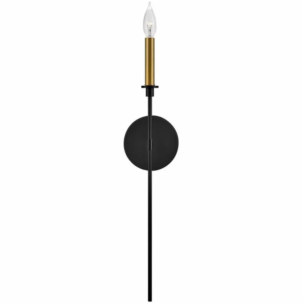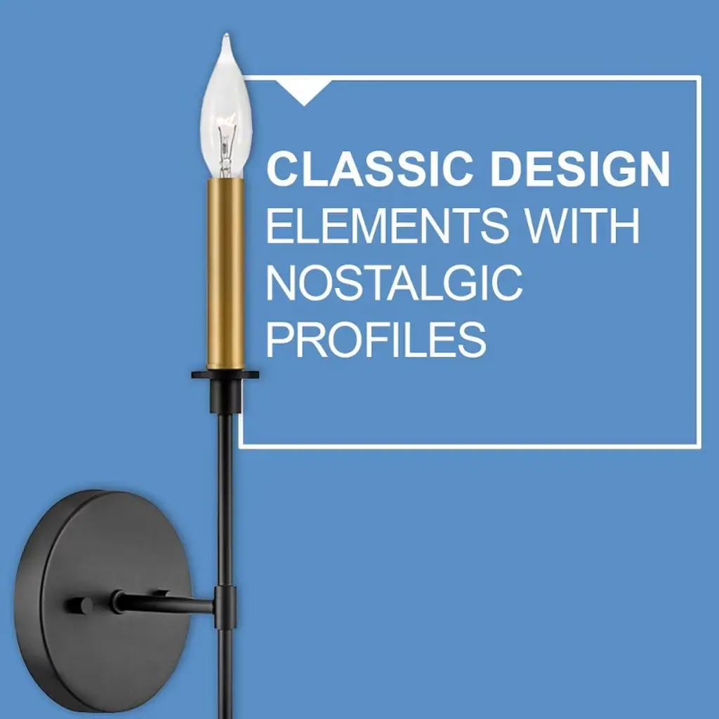 If you’re on the hunt for easy elegance, say hello to Hux. You can have it all with this transitional style that unites turn-of-the-century traditional taste with minimalist modern chic. Dramatic Black metal stems perfectly contrast dreamy Lacquered Brass candle sleeves to reveal a bold and balanced design. Material: Steel, Finish Color: Black/Lacquered Brass, Width: 5.25", Height: 24", Length: 5", Depth: 5", Height From Outlet Box: 9.75", Backplate Width: 5.25", Backplate Length: 5.25", Lamping Type: Incandescent, Number Of Bulbs: 1, Wattage: 60 Watts, Dimmable: Yes,
