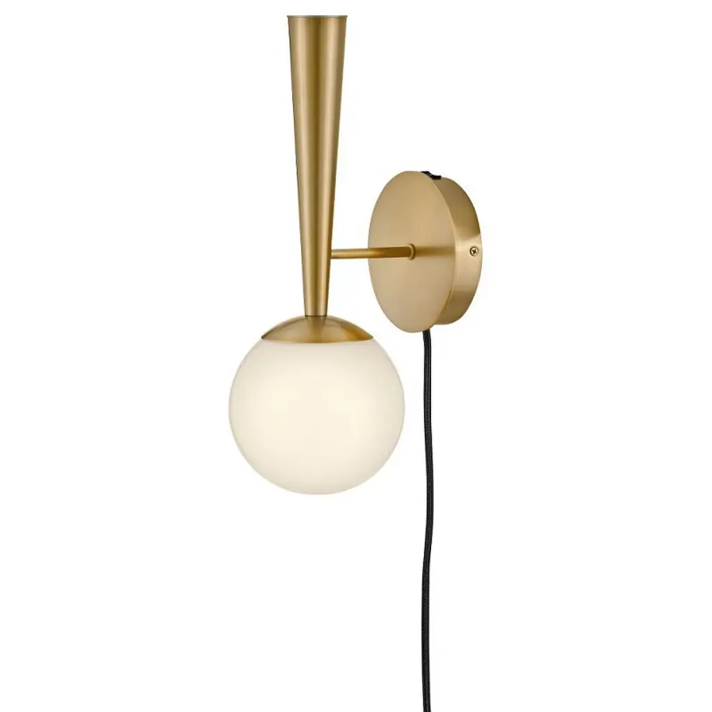 Talk about effortlessly cool. Izzy delivers the perfect mix of structural beauty and simplicity. The long, tapered lines are balanced by the shapely, cased opal globe for an intriguing silhouette. The sconce’s profile has a commanding presence whether you choose to mount it up or down. Plus, the versatility continues with the option to hardwire or mount as a plug-in sconce with a functional on/off switch. Finished in bold Black or Lacquered Brass, Izzy takes center stage in any space.