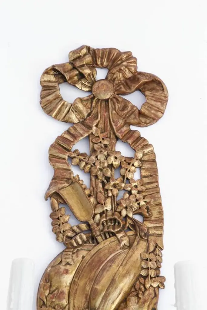Pair of finely carved Italian giltwood and bronze sconces with bow and tassel motif. The sconces have been newly wired. They are priced as a pair.