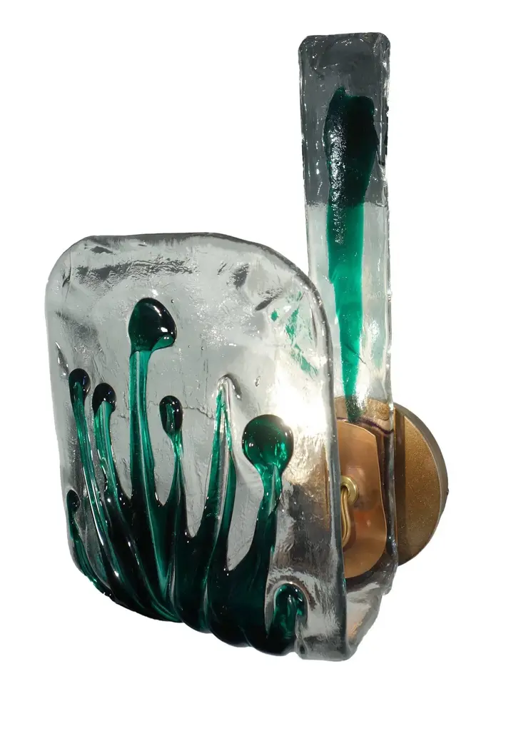 Fabulous Italian Art Nouveau style Murano Attributed thick art glass with fern motif, circa 1970, recently fashioned masterfully into delightful candle sconces with copper finish fixture. Fixture design by Gibson Lighting International for Bellini's Antique Italia. UL wired for wall mount. Ready to be installed. Six available. Dimensions: 13" high, 9" deep, 8" wide