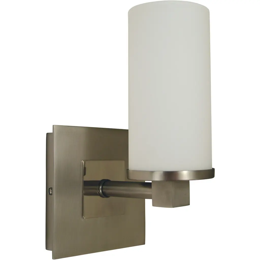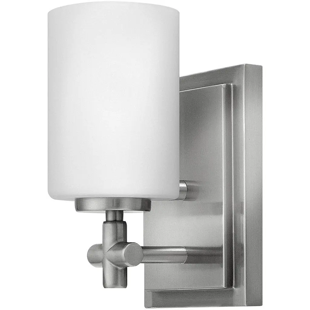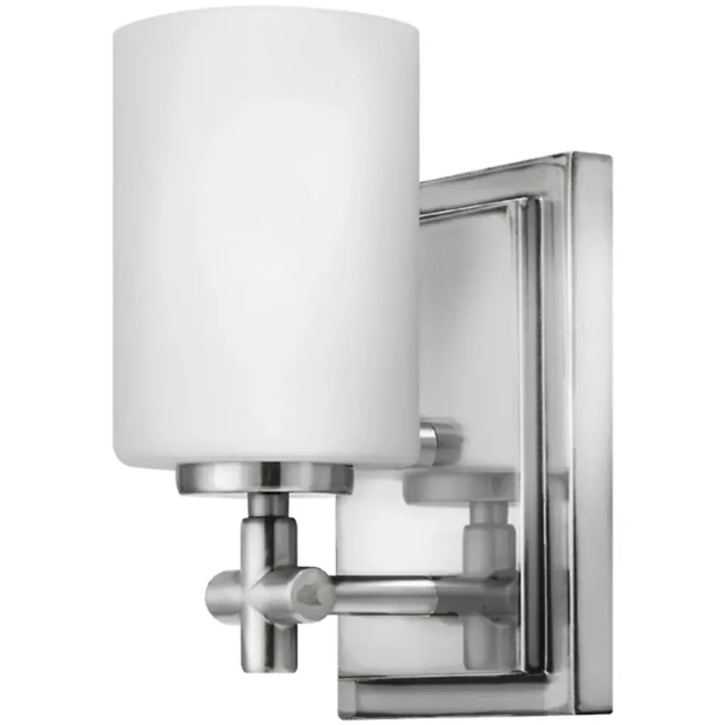 A clean, contemporary piece with industrial trimmings. The Laurel Wall Sconce by Hinkley Lighting features an Etched Opal glass shade atop a finished-steel holder and wall plate. The arm extending from the wall plate ends in a cross design that looks like a conventional handle for a bathroom faucet. The holder and wall plate both provide strong lines and well-defined plains that contrast beautifully with the rounded, seamless shade. Once on, a single light source radiates through the opaque glass, generating ambiance with a subtle reflective shimmer.