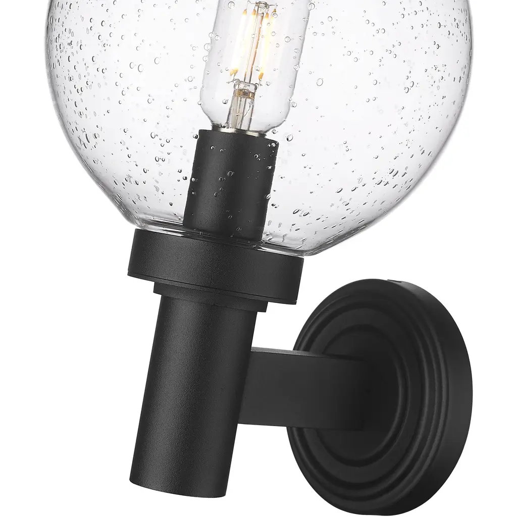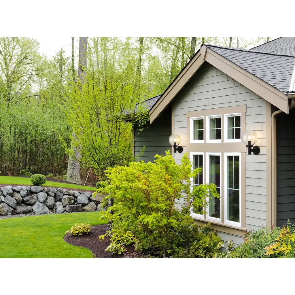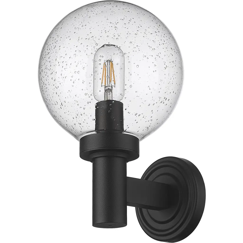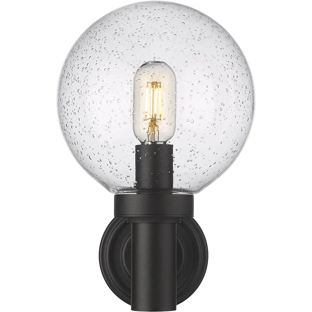 A blend of Mid-Century Modern personality and updated linear silhouetting plays into the tasteful look of a classic exterior light fixture. From the Laurent collection comes a one-light outdoor wall sconce with an updated nautical village feel. A simple yet tasteful black finish aluminum frame and wall plate hosts a chic globe shade fashioned of delicate clear seedy glass.