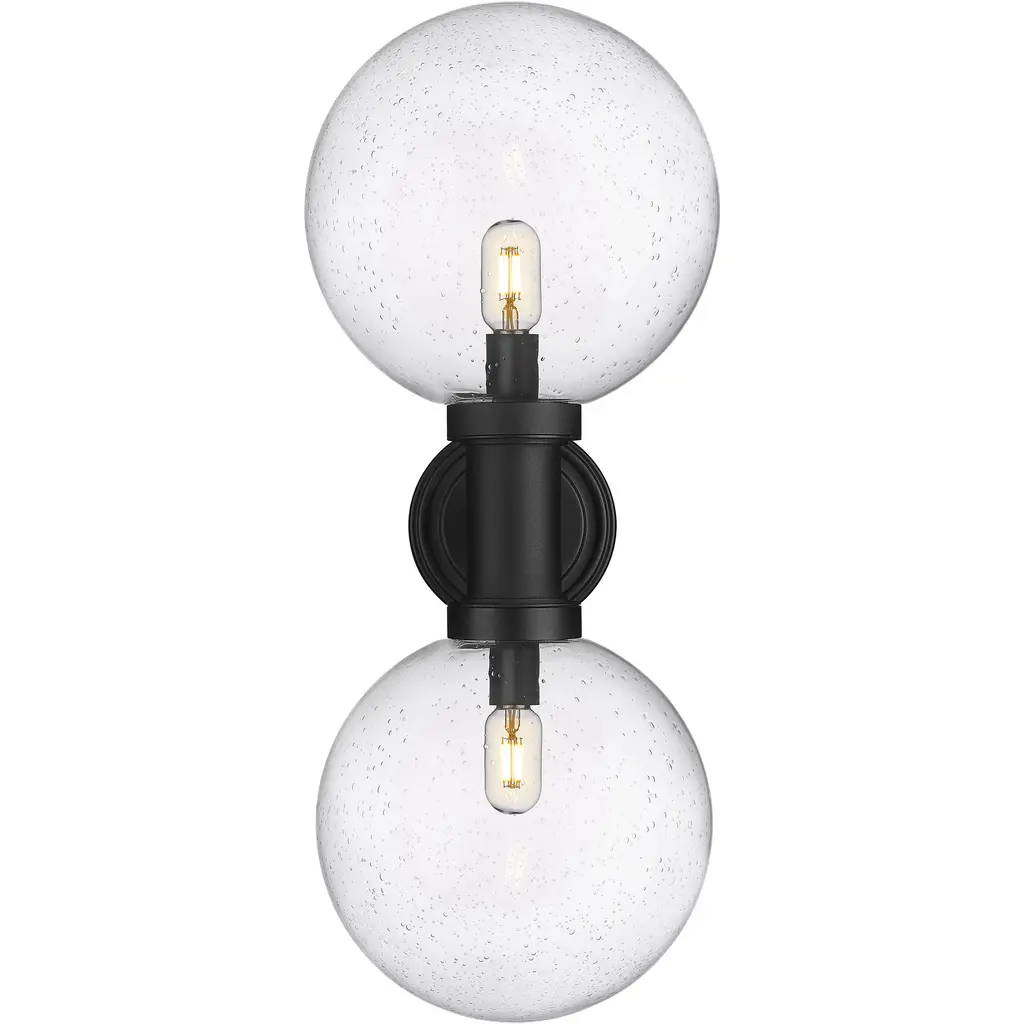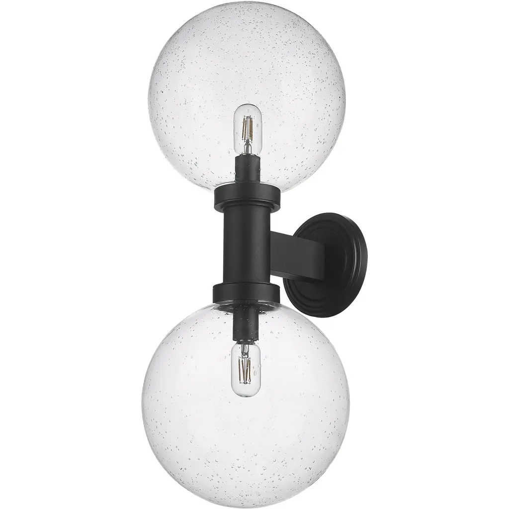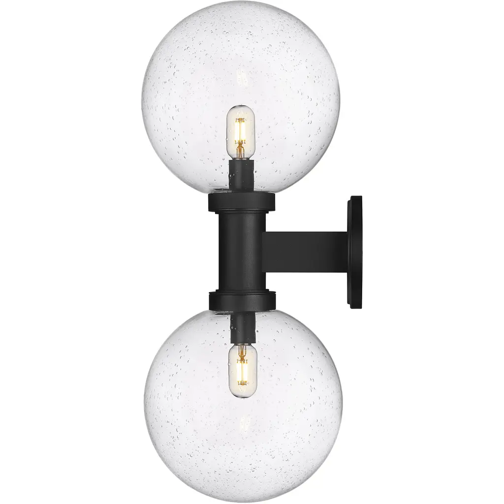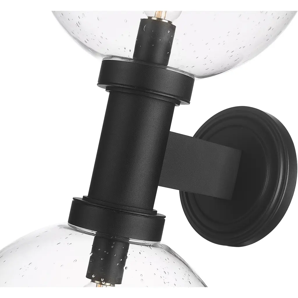 Chic elegance follows a dose of Mid-Century Modern vibes when this charming exterior light fixture elevates sophistication on a residential structure or deck space. From the Laurent collection comes a two-light outdoor wall sconce with a linear and circular blend of silhouetting. A simple yet tasteful black finish aluminum frame and wall plate hosts dual globe shades fashioned of delicate clear seedy glass.
