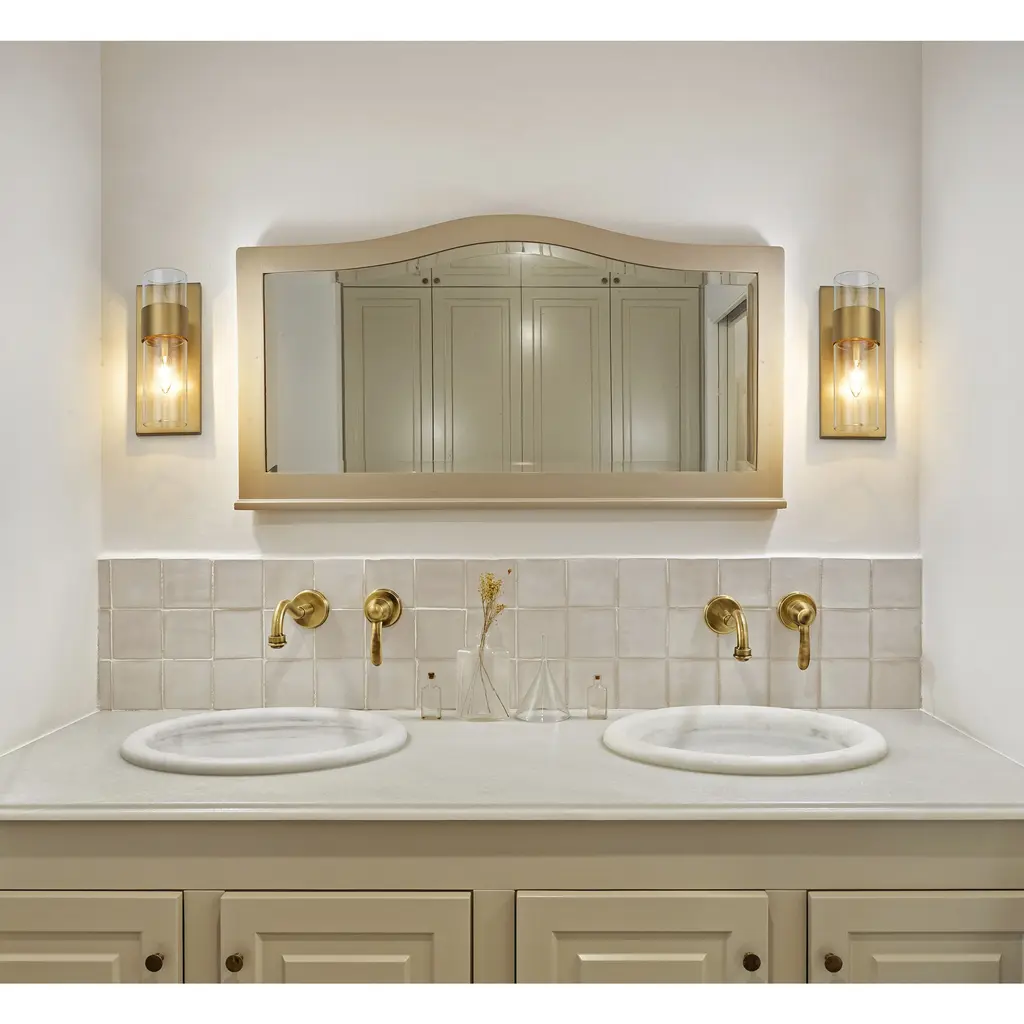 Sleek and minimal, this linear modern wall sconce illuminates a bathroom vanity or powder room with its understated sophistication. A steel plate holds a lantern-like clear glass tube that presents an exposed bulb, clasped by a wide rubbed brass ring that gives a glamorous metallic touch, complementing warm tone bathroom hardware and fixtures. With its slender shape and design, this contemporary one-light wall sconce makes itself at home, flanked beside a mirror illuminating countertops and dressing areas.