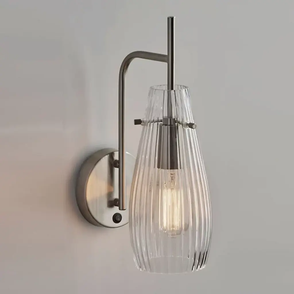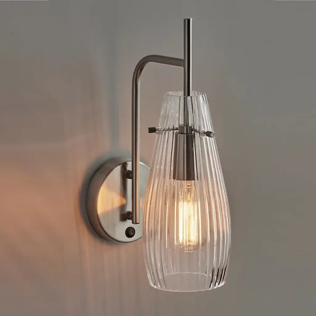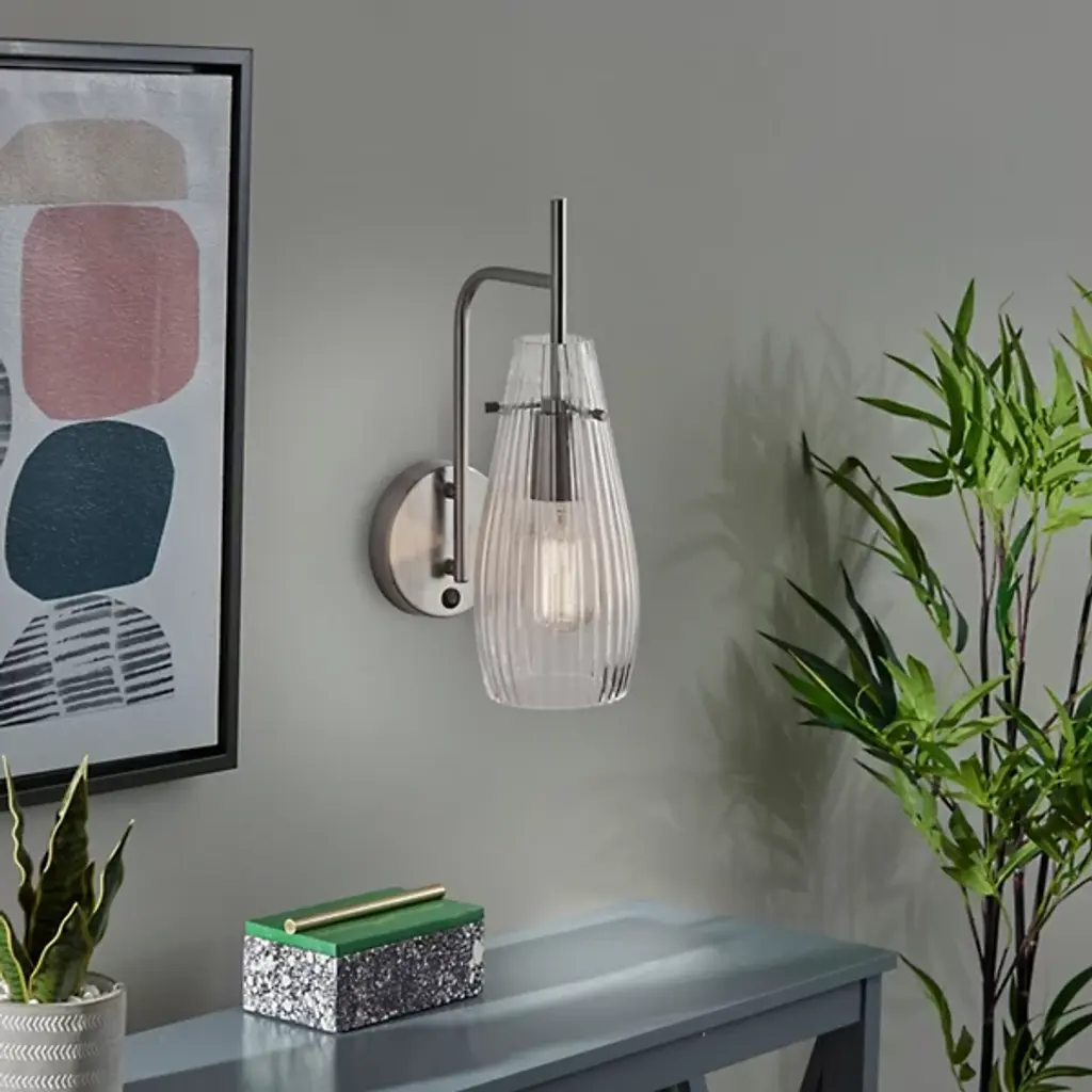 A décor-enhancer in the off or on setting. Tie your home’s sophisticated aesthetic together with the vintage-inspired design of the Layla Wall Sconce from Adesso. Let the piece flank your bed or frame your wall-mounted décor. It presents a dashing silhouette with a slender steel arm. The ribbed teardrop glass shade pays homage to mid-century styling. The striations of the glass require only a touch of light to dazzle with reflective highlights. A vintage-style lamp nestled inside produces a warm ambient glow that is cast on the intricate glass and the wall behind it.