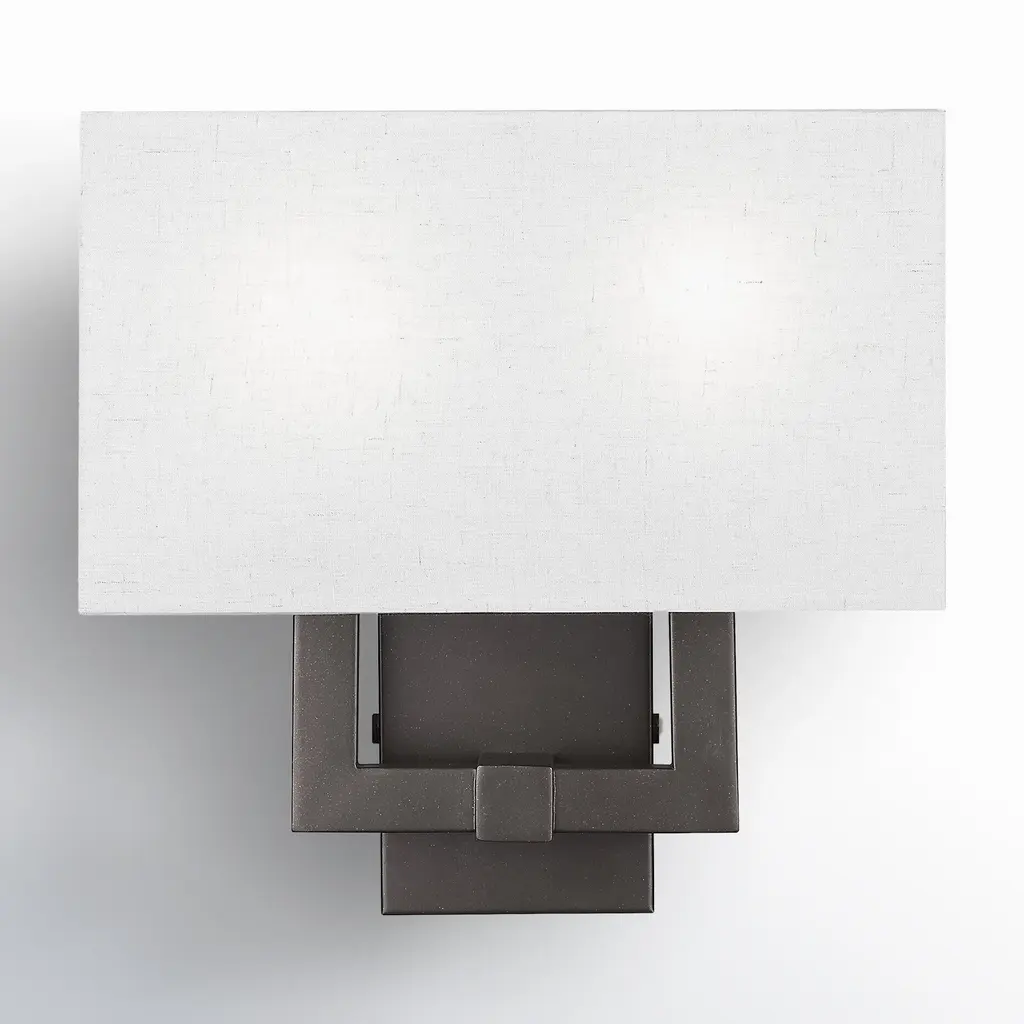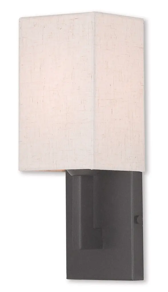 The one-light LED wall sconce has an elegant white linen shade that is open on the top and bottom which diffuses light efficiently. Ideal for bath & vanity and hospitality applications. Architectural Bronze finish.