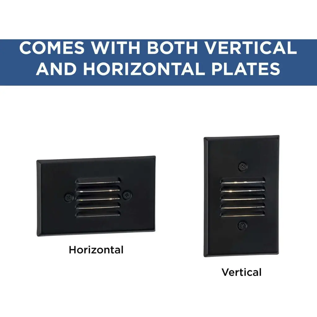 The LED Step/Wall Light finished in black will seamlessly blend into many interior and exterior architectural styles, whether residential or commercial. A horizontal and a vertical exterior face plate are provided to accommodate either a horizontally or vertically oriented installation. The step light features an integrated 120V AC light engine, eliminating the need for an additional LED driver. The light engine is enclosed in a gasketed lens, allowing it to meet the rigorous demands of wet location use. Its dimmable LED light source offers optimized, energy-efficient light output, 3000K, 90CRI. The louvered face plates direct the light downwards to minimize glare and clearly illuminate stairs, walls, and walkways and resulting in performance, cost and safety benefits. It is cCSAus wet location rated for use in areas with direct water contact.