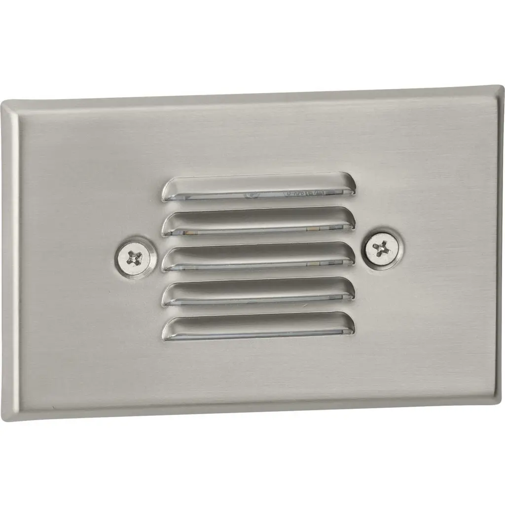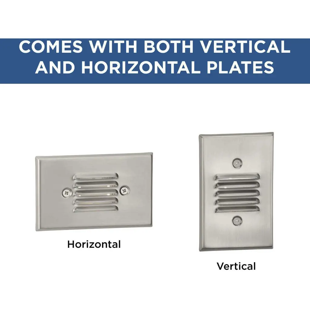 The LED Step/Wall Light finished in brushed nickel will seamlessly blend into many interior and exterior architectural styles, whether residential or commercial. A horizontal and a vertical exterior face plate are provided to accommodate either a horizontally or vertically oriented installation. The step light features an integrated 120V AC light engine, eliminating the need for an additional LED driver. The light engine is enclosed in a gasketed lens, allowing it to meet the rigorous demands of wet location use. Its dimmable LED light source offers optimized, energy-efficient light output, 3000K, 90CRI. The louvered face plates direct the light downwards to minimize glare and clearly illuminate stairs, walls, and walkways and resulting in performance, cost and safety benefits. It is cCSAus wet location rated for use in areas with direct water contact.