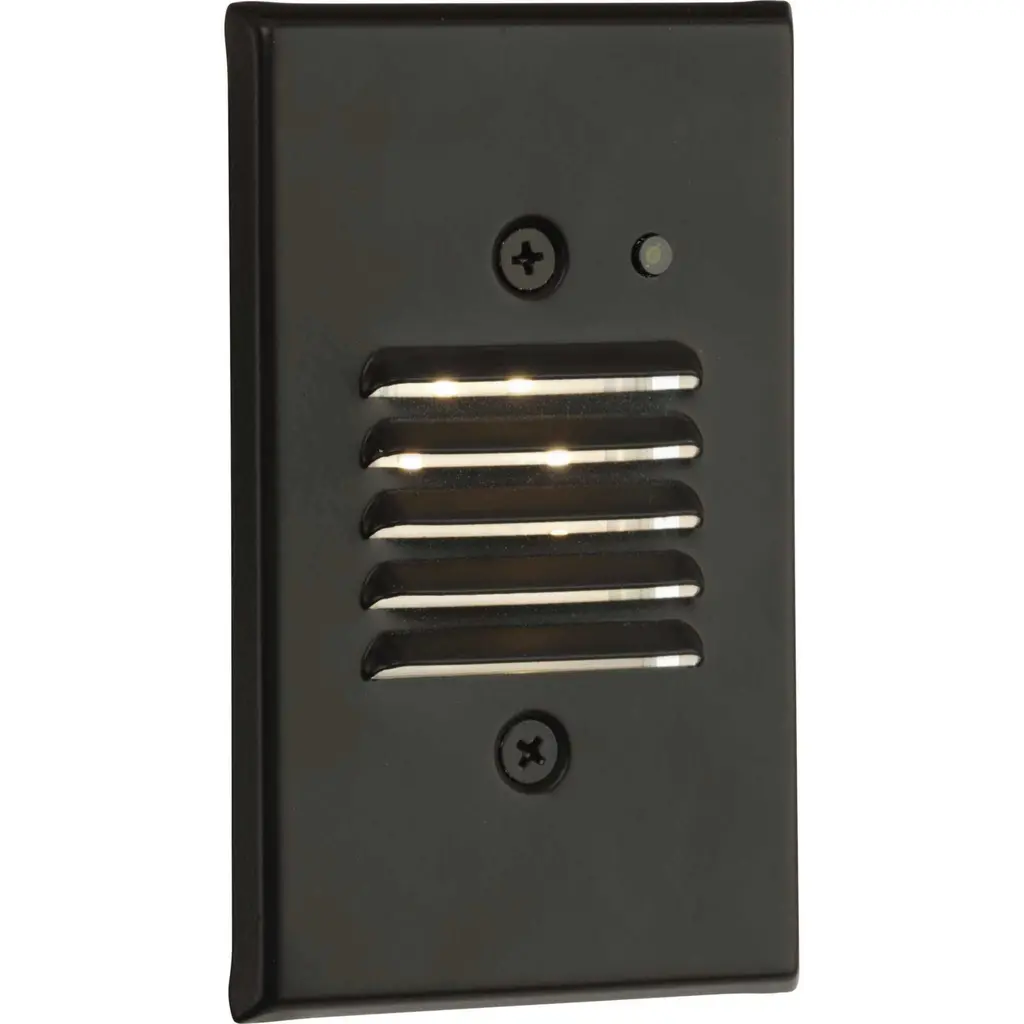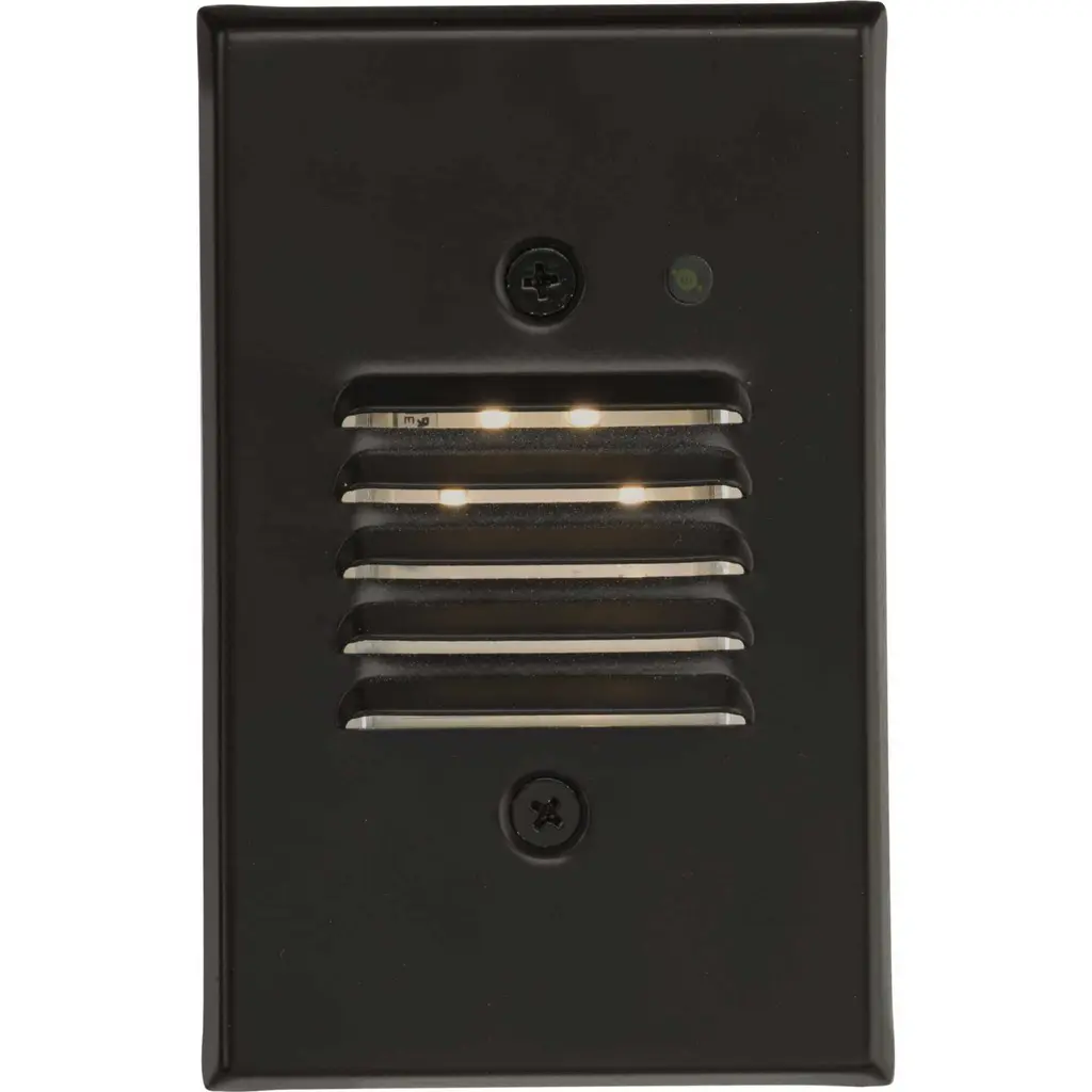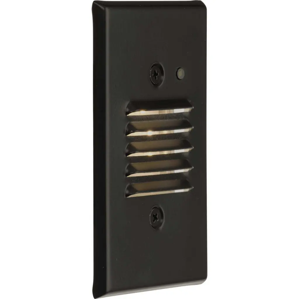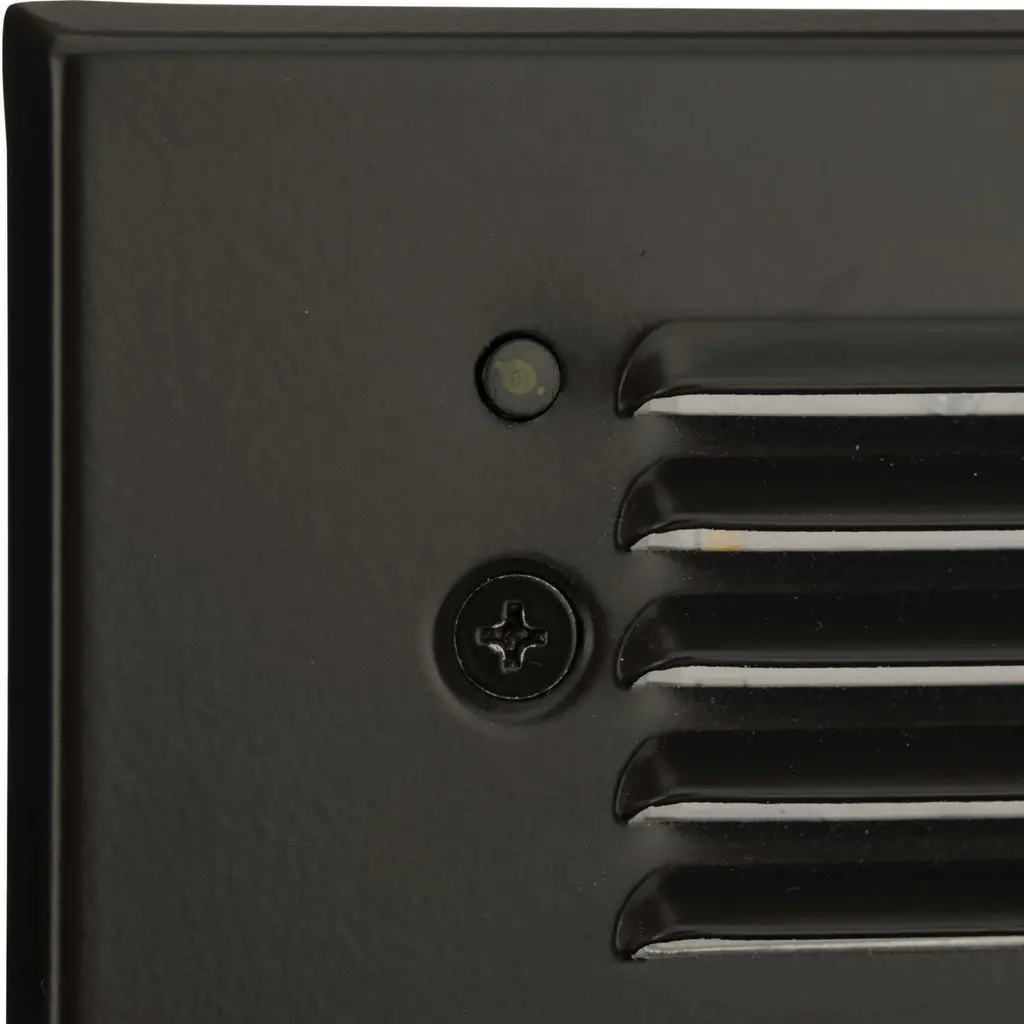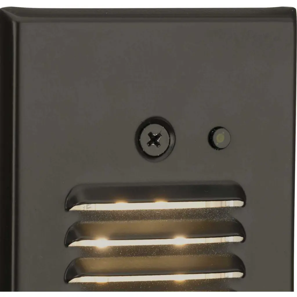 The LED Step/Wall Light finished in mellow antique bronze offers an elevated look to exterior architectural styles, whether residential or commercial. A horizontal and a vertical exterior face plate are provided to accommodate either a horizontally or vertically oriented installation. The step light features an integrated photocell with automatic dusk to dawn operation, automatically turning the fixture on and off at sunset and sunrise, eliminating the need for additional controls. The photocell and LED assembly is enclosed in a gasketed lens, allowing it to meet the rigorous demands of wet location use. The louvered face plates direct the light downwards to minimize glare and clearly illuminate stairs, walls, and walkways, resulting in performance, cost and safety benefits. It is cCSAus wet location rated for use in areas with direct water contact.