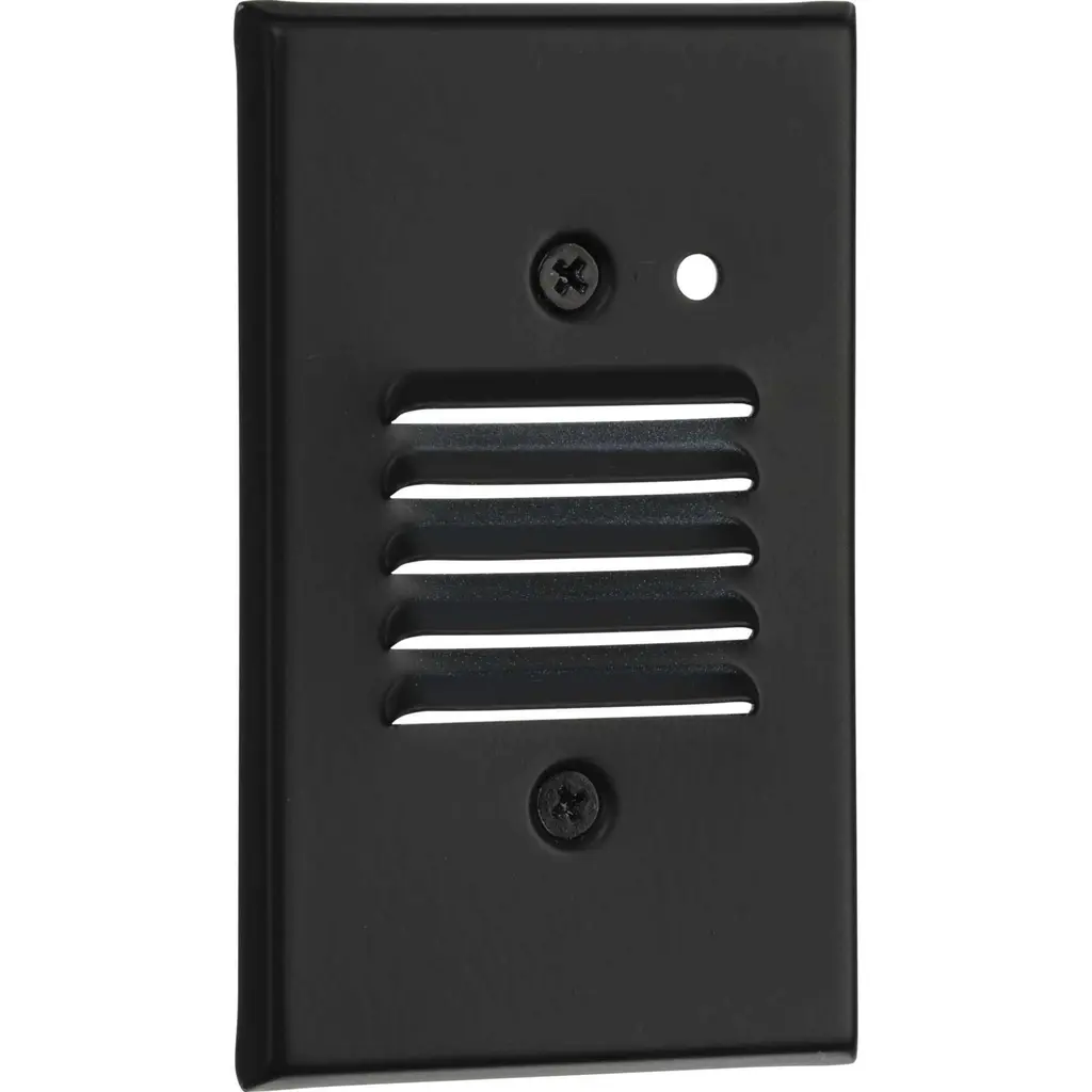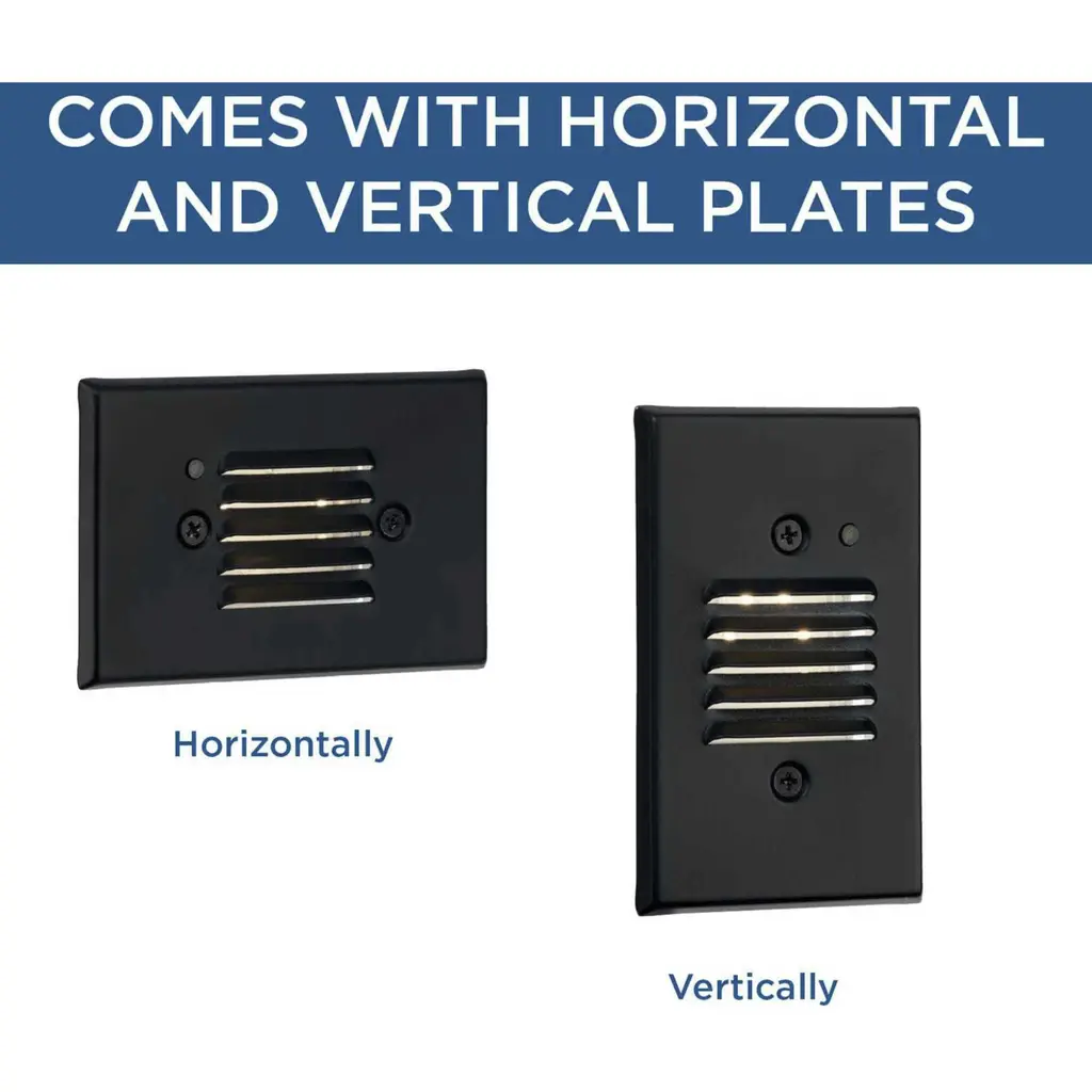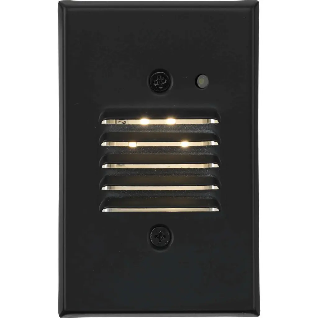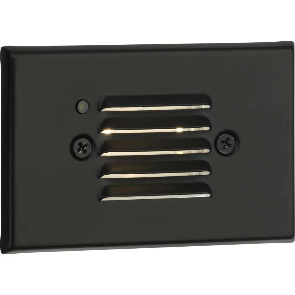 The LED Step/Wall Light finished in classic black offers an elevated look to exterior architectural styles, whether residential or commercial. A horizontal and a vertical exterior face plate are provided to accommodate either a horizontally or vertically oriented installation. The step light features an integrated photocell with automatic dusk to dawn operation, automatically turning the fixture on and off at sunset and sunrise, eliminating the need for additional controls. The photocell and LED assembly is enclosed in a gasketed lens, allowing it to meet the rigorous demands of wet location use. The louvered face plates direct the light downwards to minimize glare and clearly illuminate stairs, walls, and walkways, resulting in performance, cost and safety benefits. It is cCSAus wet location rated for use in areas with direct water contact.