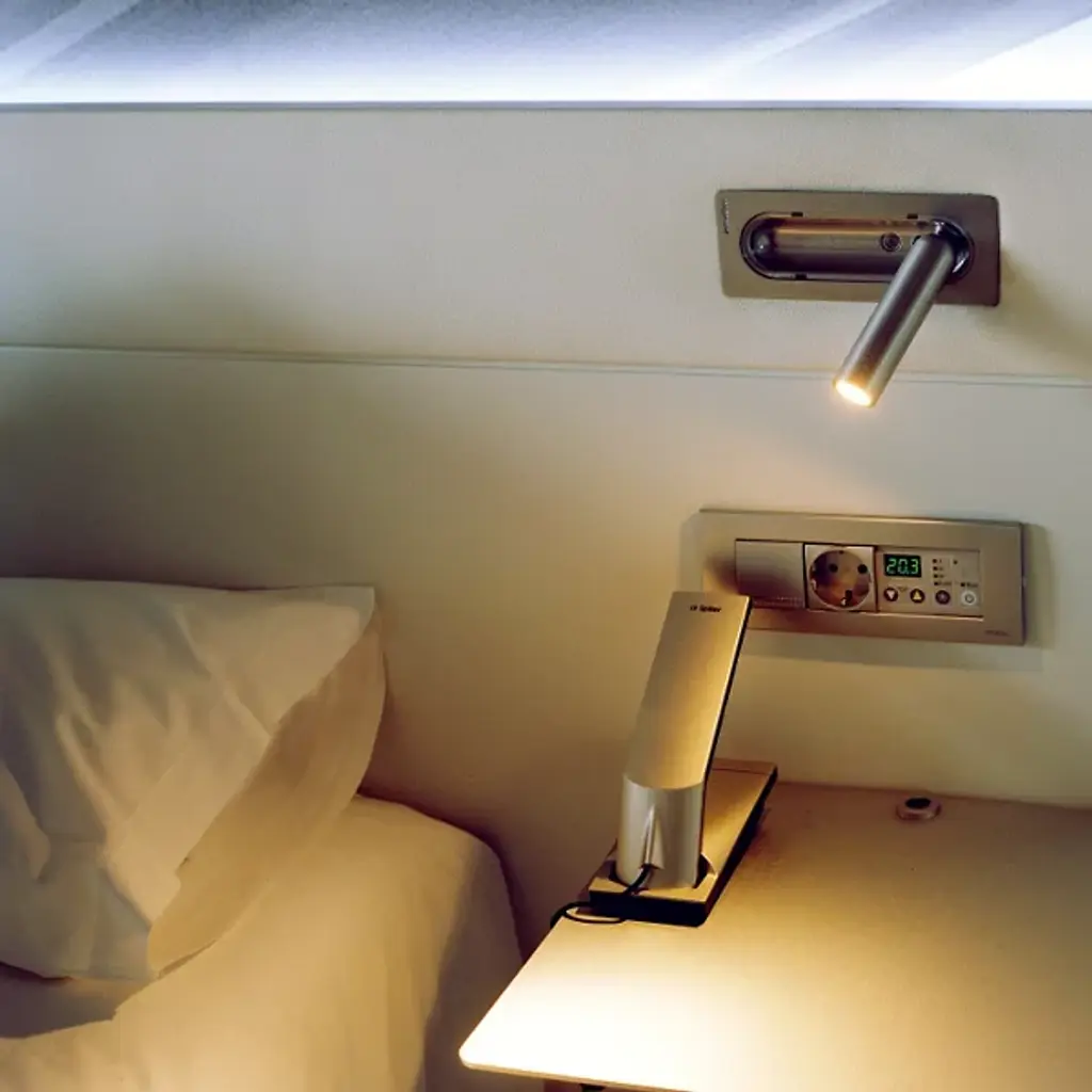From Marset and designed by Daniel Lopez, the Ledtube RSC LED Wall Sconce is an adjustable wall lamp that incorporates energy efficient LED technology and a 24-degree lens that directs a sharp beam of light. This fixture features an adjustable head and a honeycomb grill in the lens to trap peripheral light and avoid glare. Its modern design combines simple shapes made of injected aluminum and a frontal part made of transparent polycarbonate. Ledtube's automatic on/off technology makes it easy to use: pull the lamp out of the base element to turn it on and slide it back into place to turn it off.