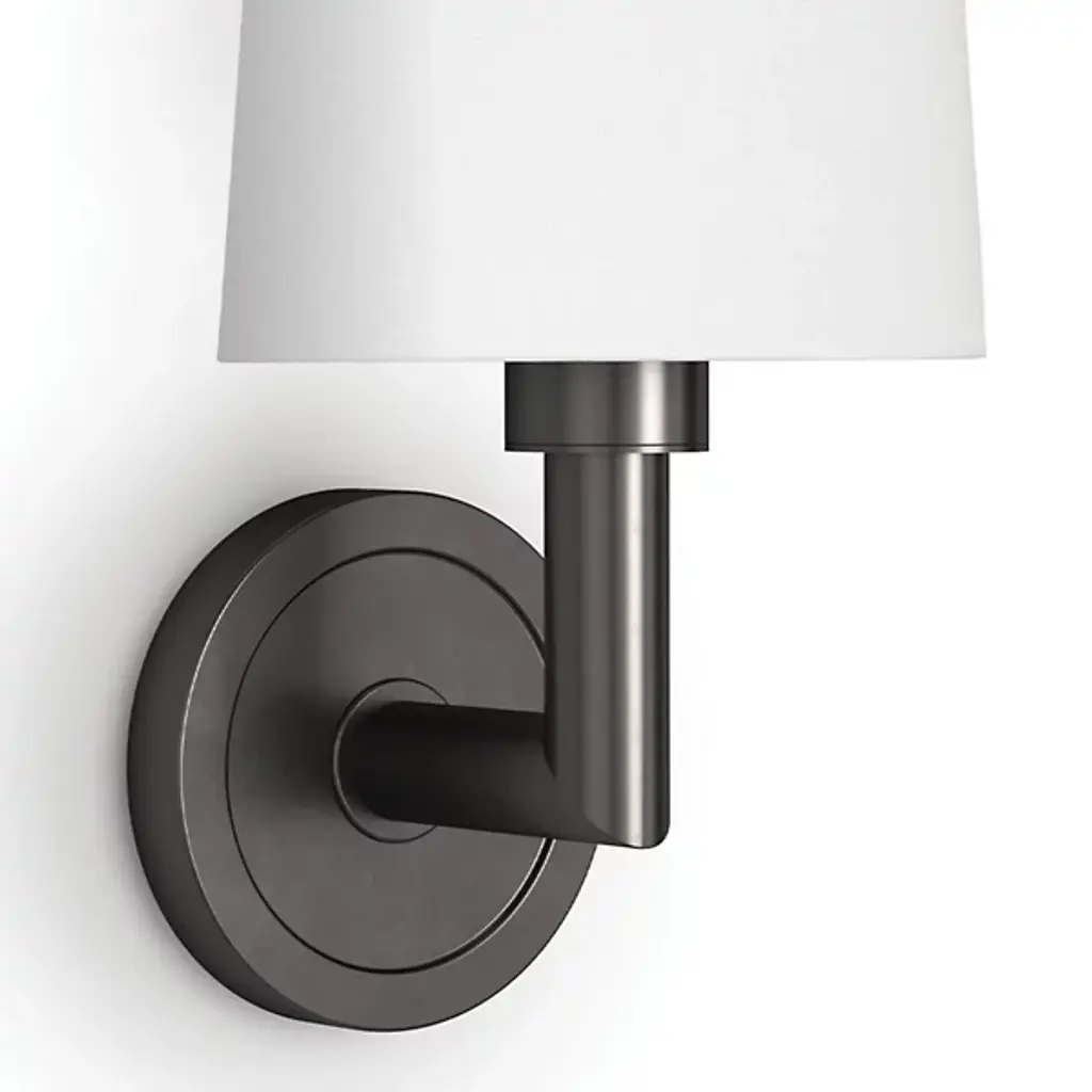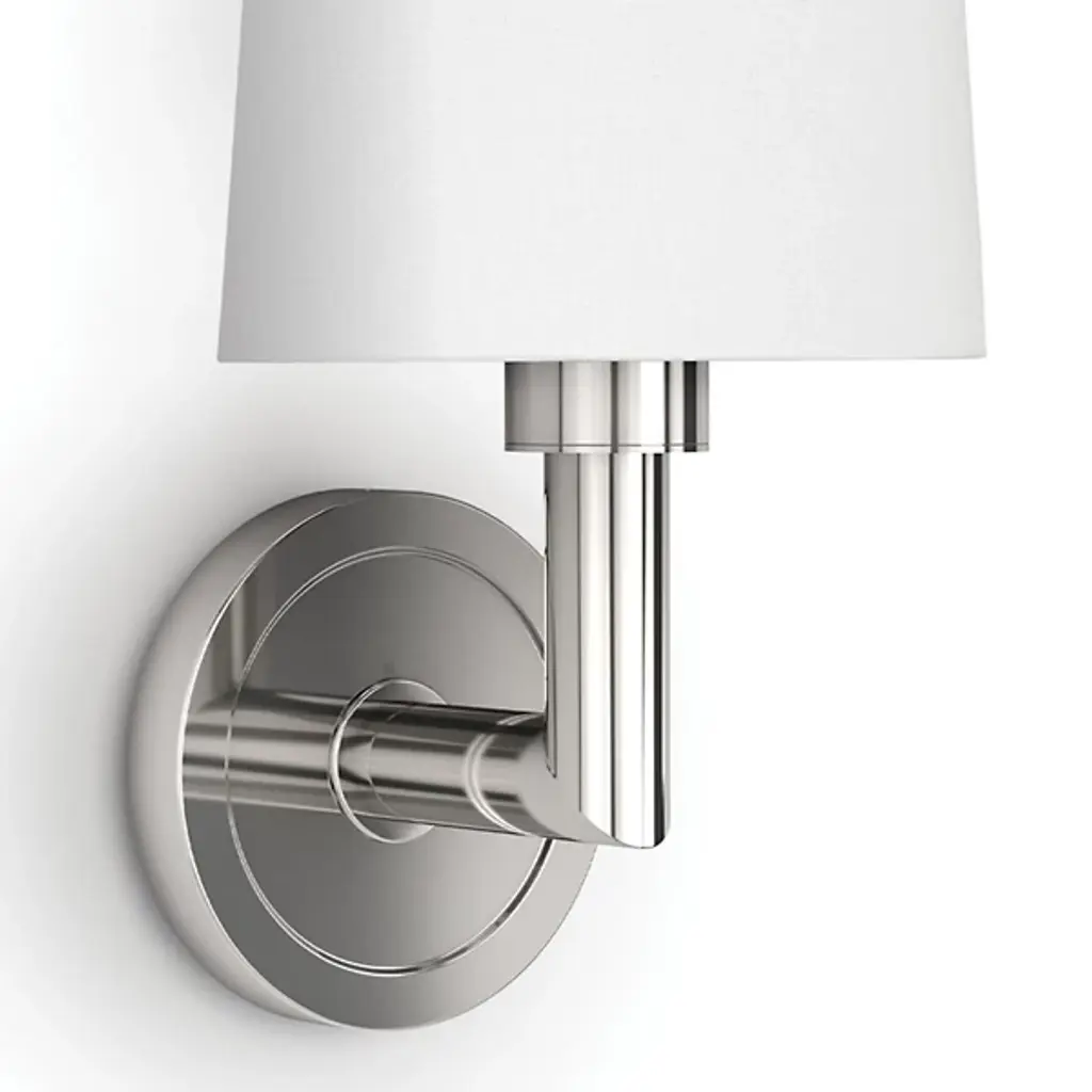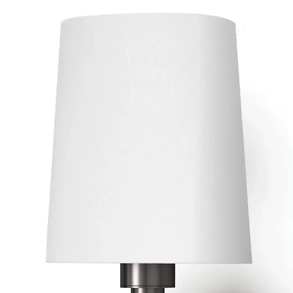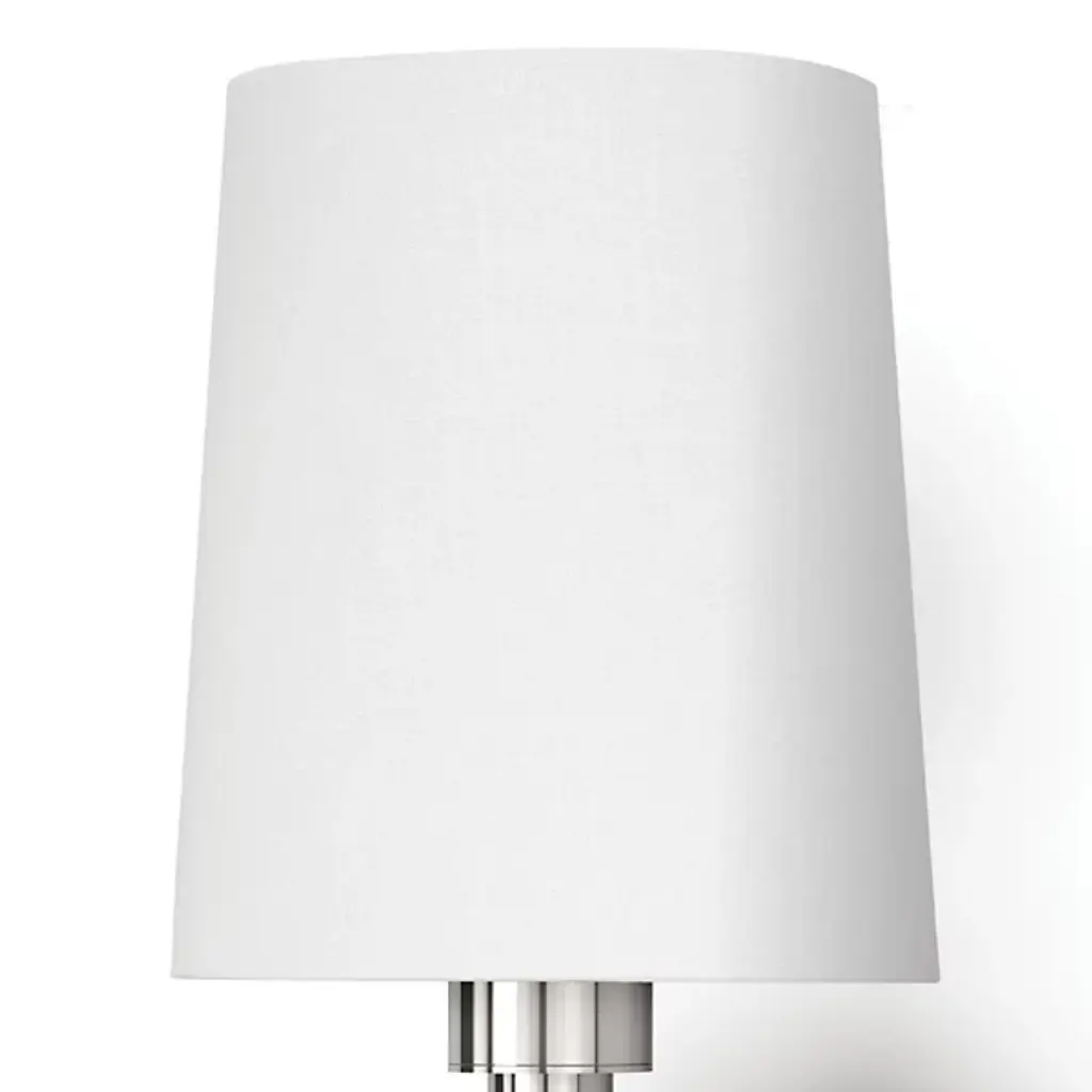 Enhance indoor walls with the clean lines and smooth design of the Legend Wall Sconce from Regina Andrew. A design that maintains clear, simple lines while still insisting on attention, it uses a contoured disc wall plate and right-angled central arm to support a single strong candelabra lamp tucked beneath a flaring linen shade. The translucent texture of the linen eases direct brightness, distributing a wash of light below the fixture and an even ambiance around it.