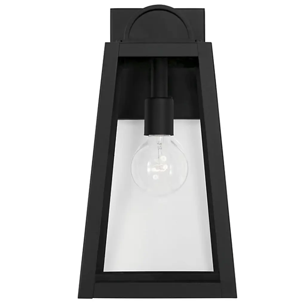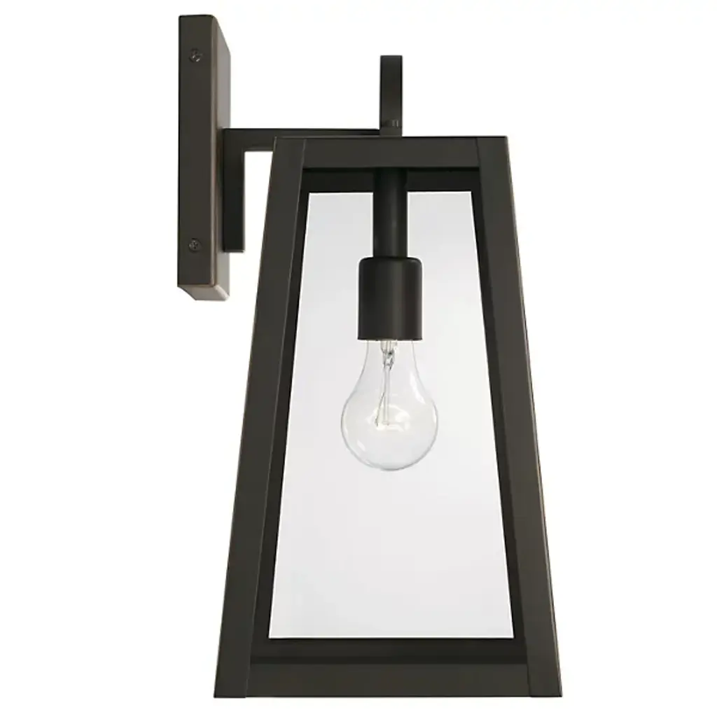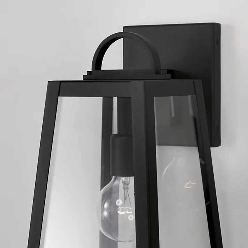 Presented by Capital Lighting, the Leighton 943711 Outdoor Wall Sconce is a mid-mod inspired luxury light furnishing with transitional style. A slanted, boxy metallic frame pairs with clear glass panes to expose the bulb and fixture within. Meant for display among outdoor spaces of choice, they can stand alone or be installed in multiples for vibrant illumination.