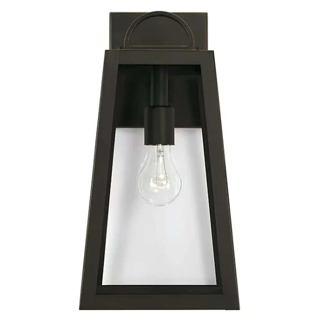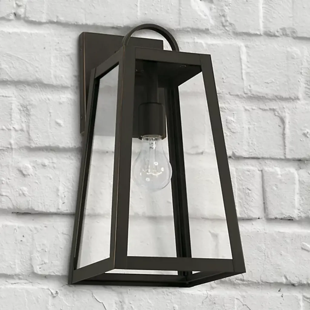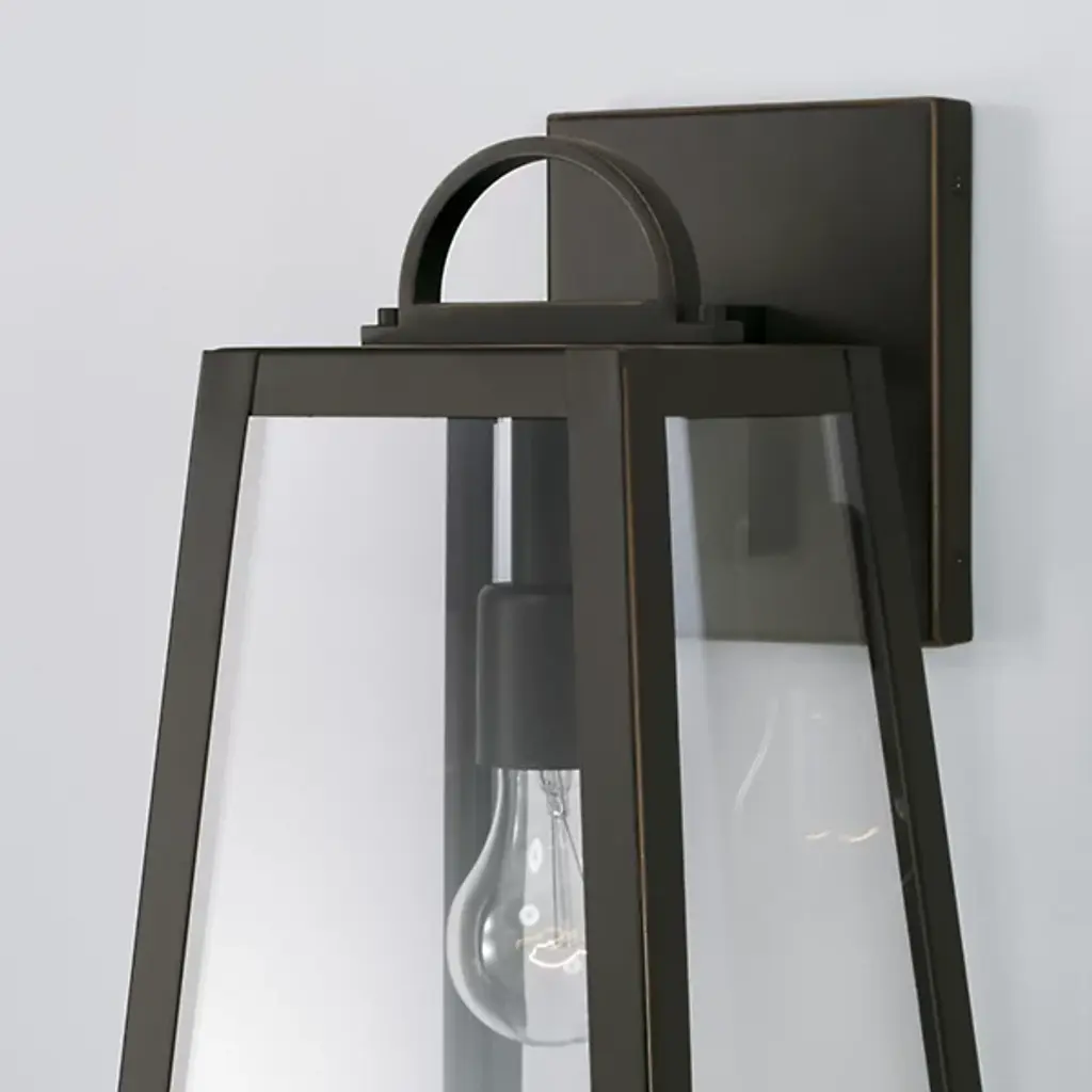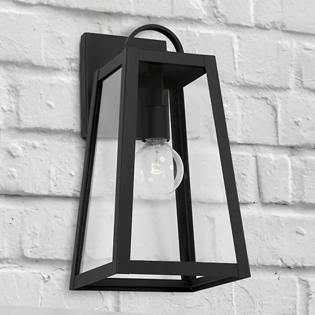 Presented by Capital Lighting, the Leighton 943711 Outdoor Wall Sconce is a mid-mod inspired luxury light furnishing with transitional style. A slanted, boxy metallic frame pairs with clear glass panes to expose the bulb and fixture within. Meant for display among outdoor spaces of choice, they can stand alone or be installed in multiples for vibrant illumination.