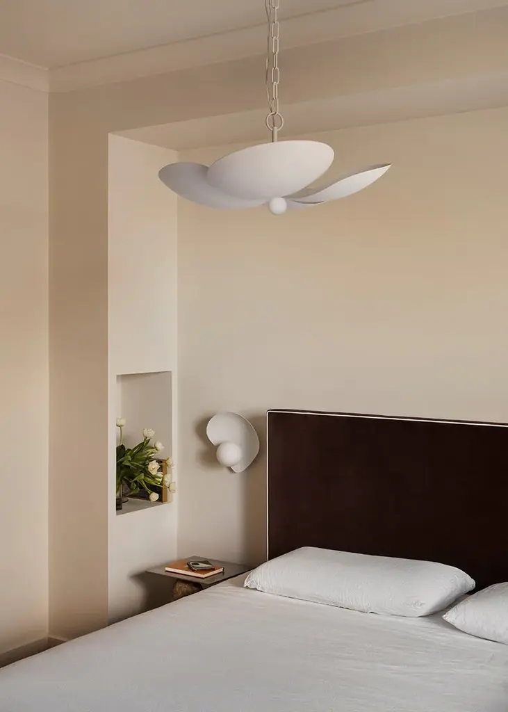 Beautiful and botanical, Leni features a petal-shaped shade that is chic and soothing. Light fills the shade and creates uplight, and the bulb underneath provides a bright glow that reflects beautifully off the textured white shade behind it. Available as a one-light wall sconce and five-light pendant, the monochromatic, all-white finish works well with a variety of interiors.