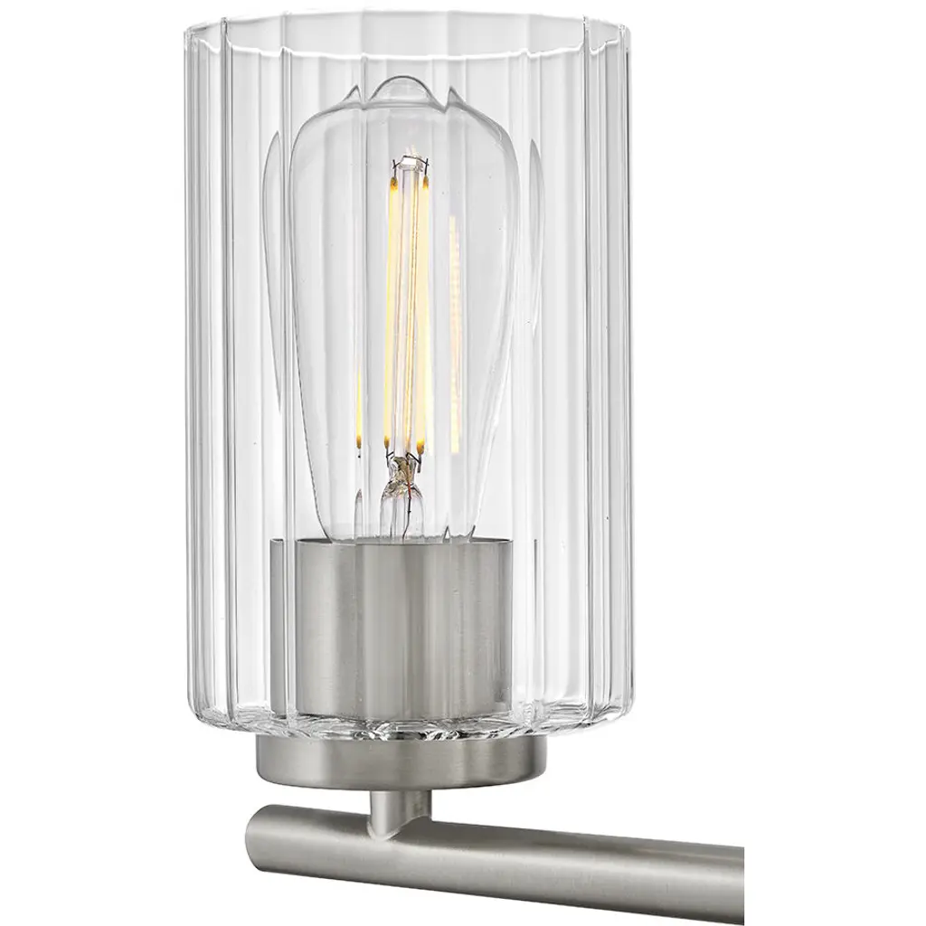 Beaming with low-key luxury, Letas clear ribbed glass glimmers with major style. Warm dimmable lamping accented by versatile Black, Brushed Nickel, or Lacquered Brass finishes fills any powder room with a refreshing glow.