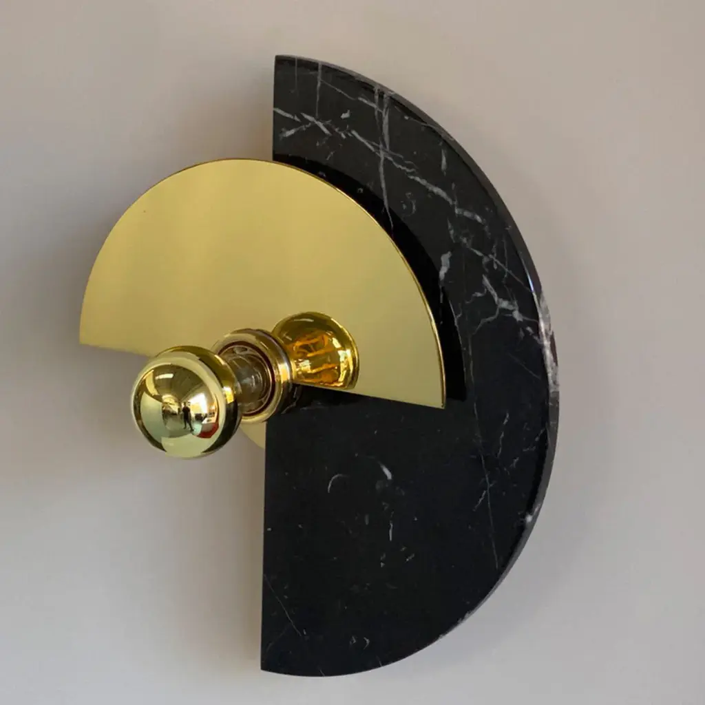 The Levante wall sconce with its circular shape is a strong reference to the sun. The possibility of placing the discs in 12 different positions offers original plays of light and shadow projected on the wall. The brass structure and disc, combined with the other marble disc, are illuminated by a light bulb with a golden cap, which emphasizes the tones of the materials and, at the same time, illuminates the wall with warm colors.