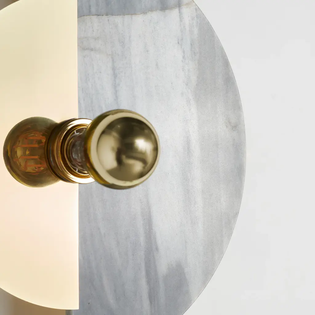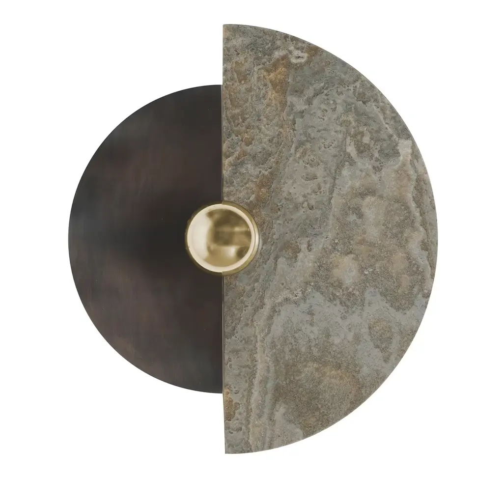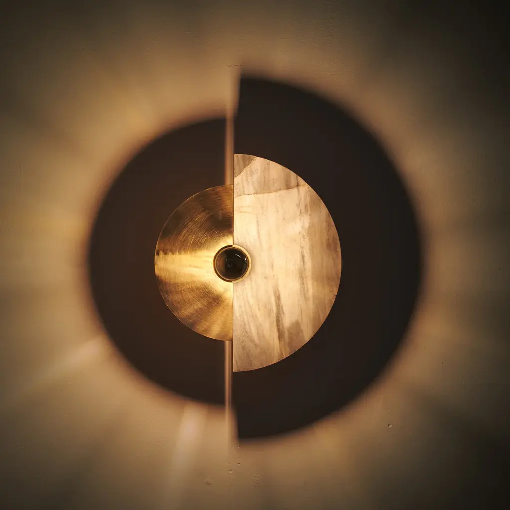 The Levante wall sconce with its circular shape is a strong reference to the sun. The possibility of placing the discs in 12 different positions offers original plays of light and shadow projected on the wall. The brass structure and disc, combined with the other onyx disc, are illuminated by a light bulb with a golden cap, which emphasizes the tones of the materials and, at the same time, illuminates the wall with warm colors.