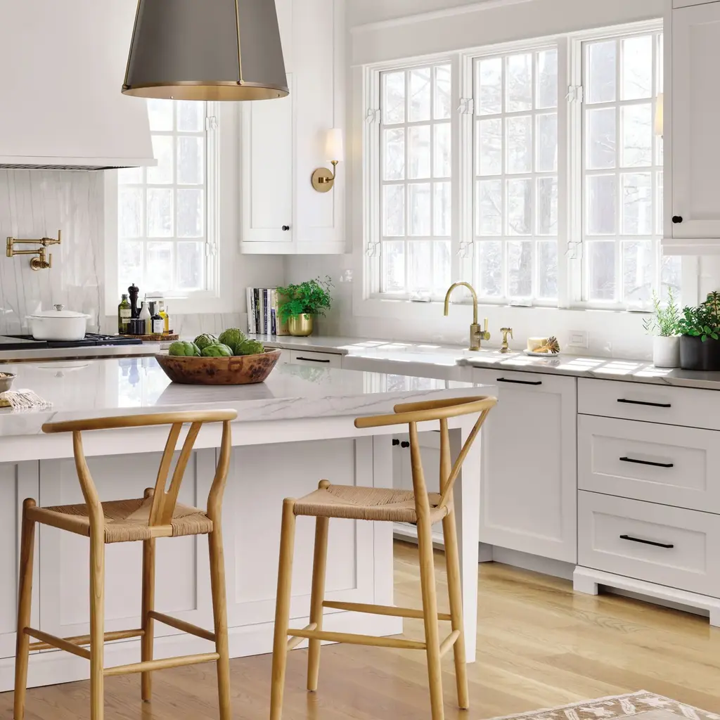 Lewis offers traditional charm paired with updated, transitional elements. Tall natural paper shades feature fine stitching detail against a Black Oxide or Heritage Brass finish to enhance timeless interiors. Features