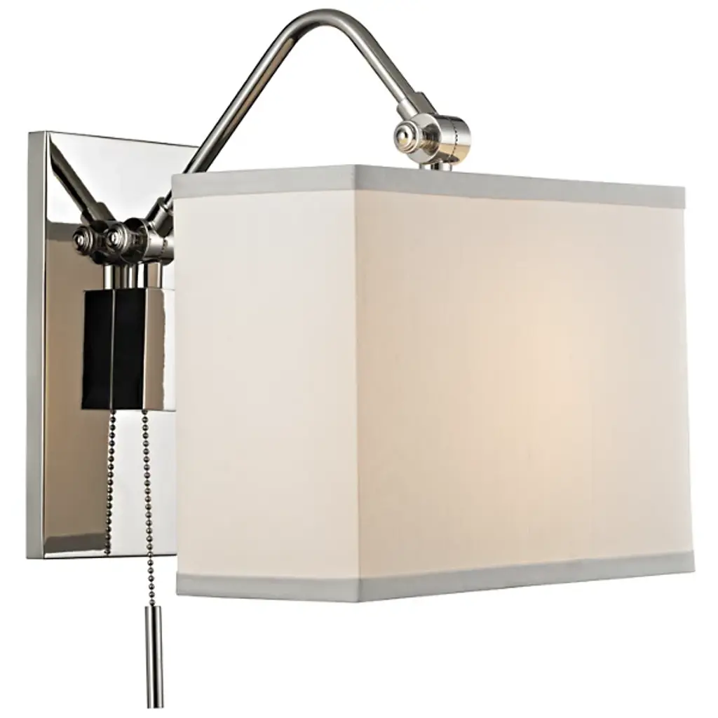 The Hudson Valley Leyden Wall Sconce is simple and versatile. The shade is made of fine silk, which diffuses the light in a visually pleasing as well as delicate way. With two points of adjust-ability and a pull chain, this lighting option is truly a functional as well as visually pleasing piece.