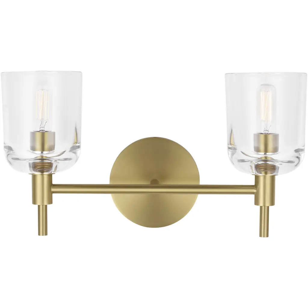 The Visual Comfort Signature, formerly known as Visual Comfort, Liaison Double Wall Sconce is like a modernized version of the time-honored wall torch. Two exposed bulbs illuminate from inside clear crackle glass shades, which is juxtaposed against bold right angles. A long thin rod sits in the middle of the glass shades, extending well beyond the fixture to add visual weight and depth.