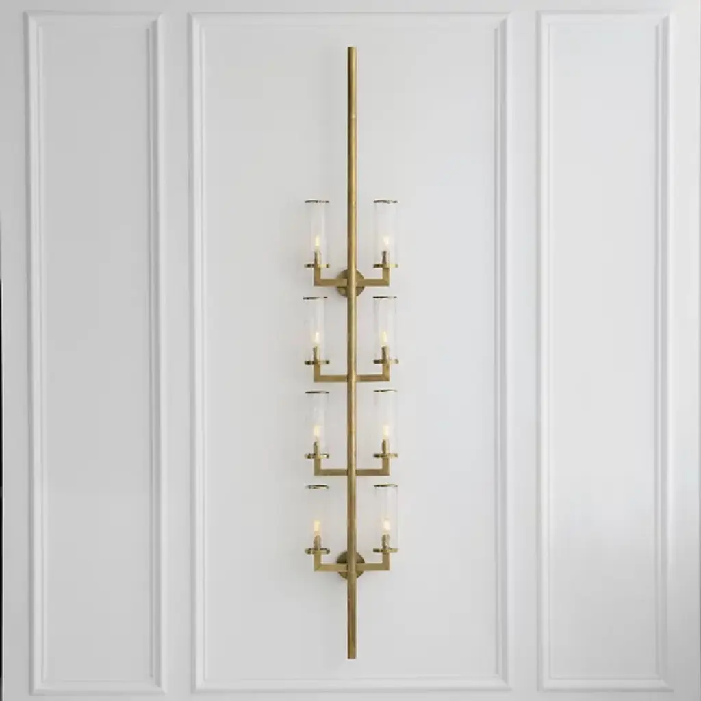 The Visual Comfort Signature, formerly known as Visual Comfort, Liaison Statement Wall Sconce is an eye catching piece that illuminates the space at an impressive scale. Four tiers of glass shades are juxtaposed against simple metalwork, allowing the delicate crackle-glass to speak for itself. Like a wall torch gone bold, your space will be lit with an innovative twist on a classic.