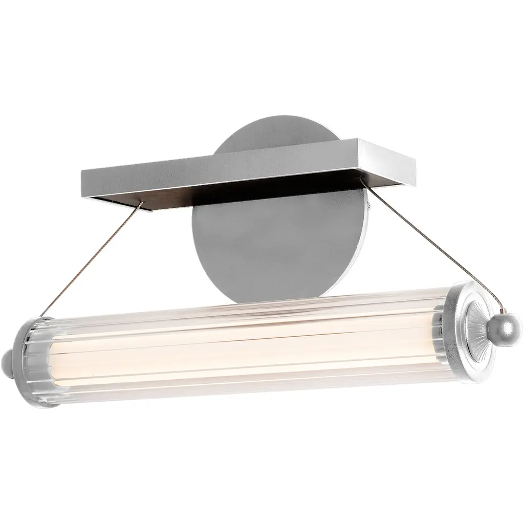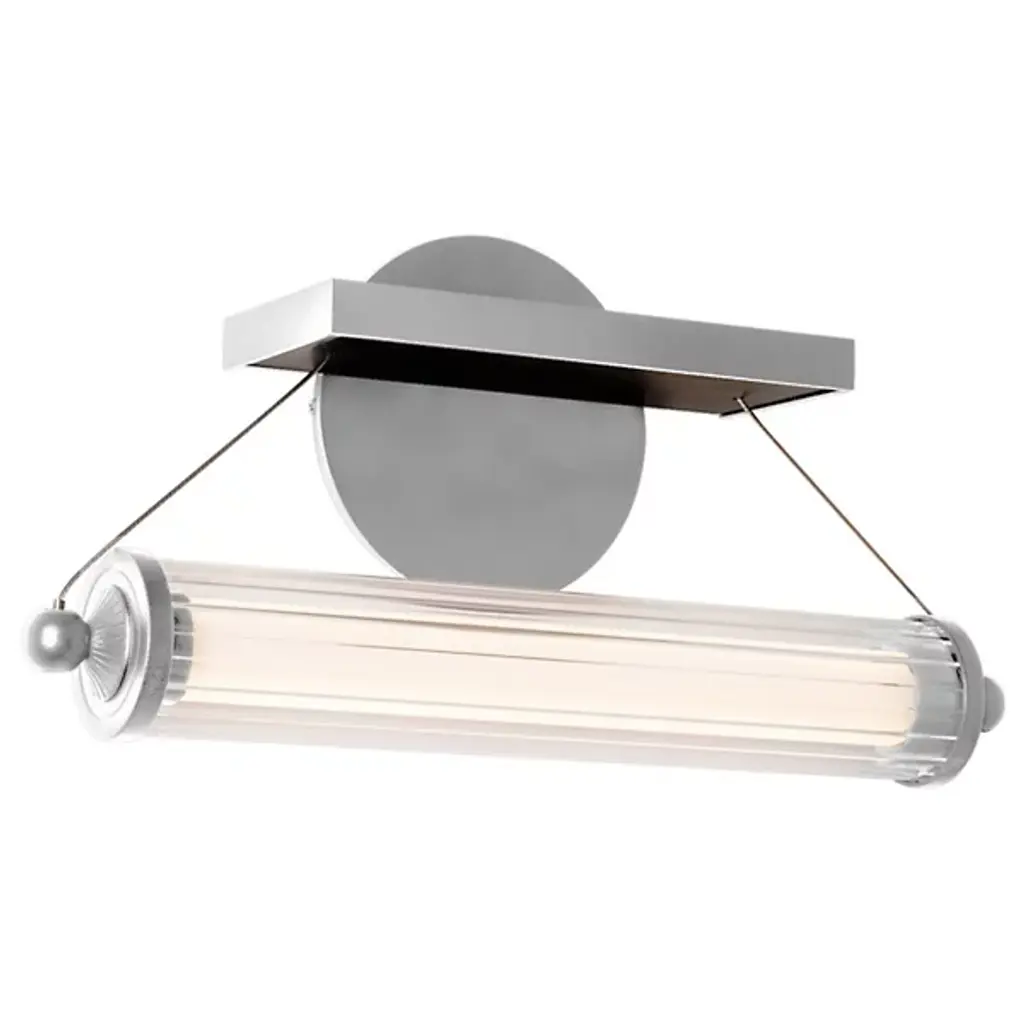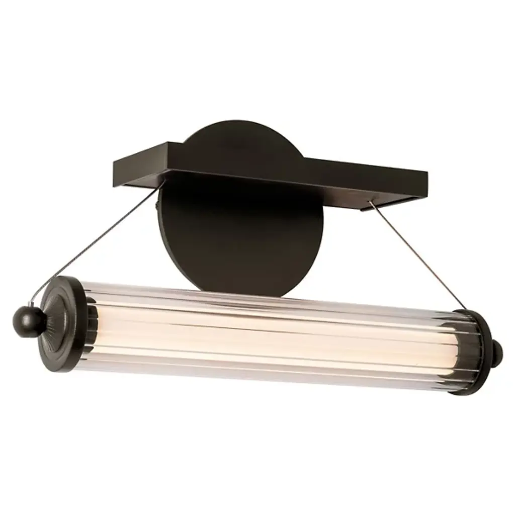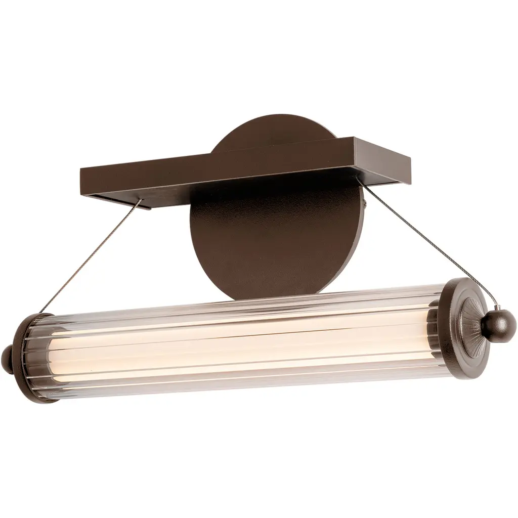 The Libra LED Wall Sconce by Hubbardton Forge is an elegant addition to spaces. Supported by a backplate that layers a bold rectangular element over a sleek circular one, a ribbed glass shade is suspended between a set of cables that provide power to the LED module within it. This fluted glass piece beautifully diffuses an even layer of light onto the surroundings and is neatly capped at either end. Able to be set at different heights to best suit the space it is in, this design makes a handsome statement.