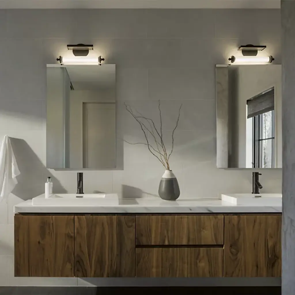 The Libra LED Wall Sconce by Hubbardton Forge is an elegant addition to spaces. Supported by a backplate that layers a bold rectangular element over a sleek circular one, a ribbed glass shade is suspended between a set of cables that provide power to the LED module within it. This fluted glass piece beautifully diffuses an even layer of light onto the surroundings and is neatly capped at either end. Able to be set at different heights to best suit the space it is in, this design makes a handsome statement.