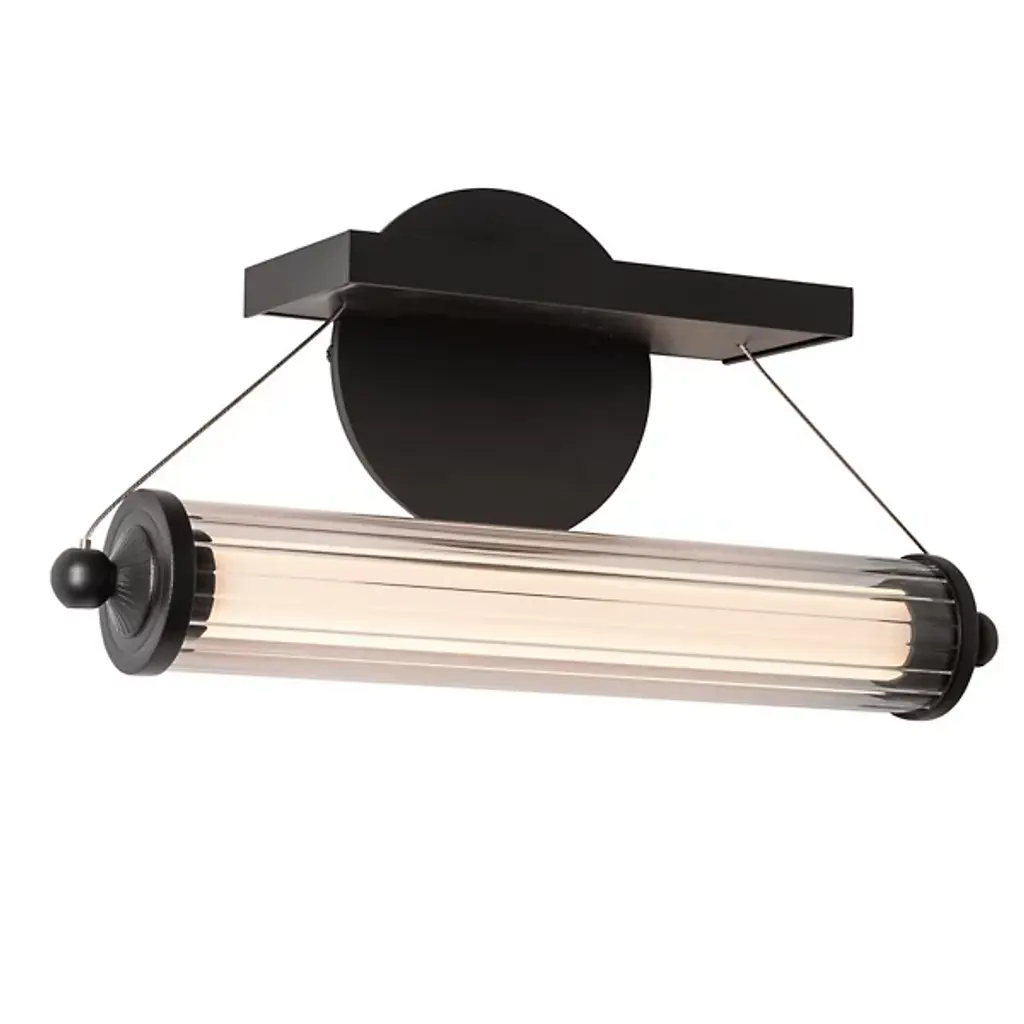 The Libra LED Wall Sconce by Hubbardton Forge is an elegant addition to spaces. Supported by a backplate that layers a bold rectangular element over a sleek circular one, a ribbed glass shade is suspended between a set of cables that provide power to the LED module within it. This fluted glass piece beautifully diffuses an even layer of light onto the surroundings and is neatly capped at either end. Able to be set at different heights to best suit the space it is in, this design makes a handsome statement.