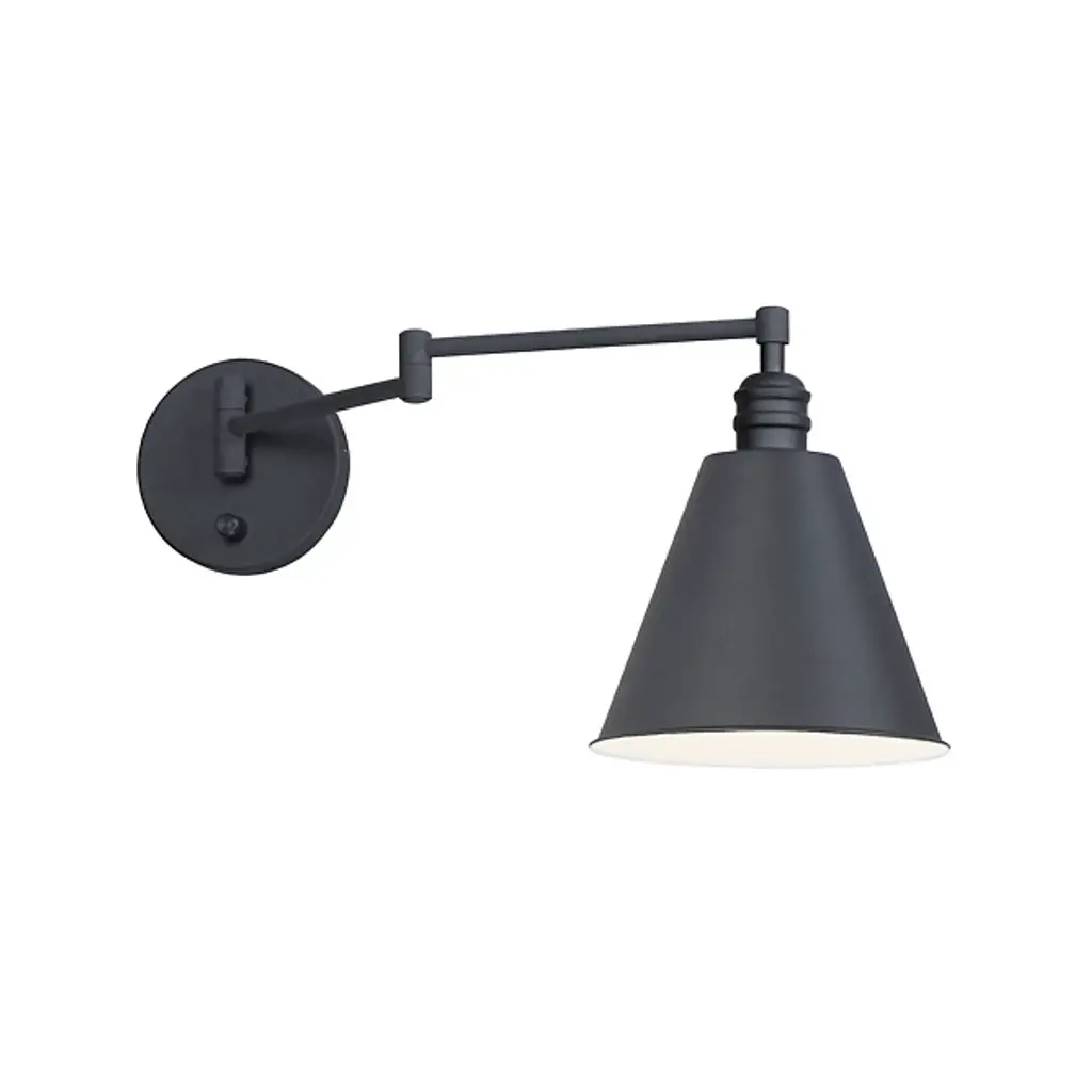 Embellish your walls and hallways with the stylish structure of the Library Swing Arm Horizontal Wall Sconce from Maxim Lighting. A refined industrial design part of a larger Library Collection, the sconce is anchored by a sleek disc wall mount and uses a two-piece pivoting arm to support a single socket lamp set inside a conical shade. The shade blocks the bright glare from the sides, focusing it into a potent pool of illumination equally suited to an indirect wall wash or brought overhead for adjustable task lighting