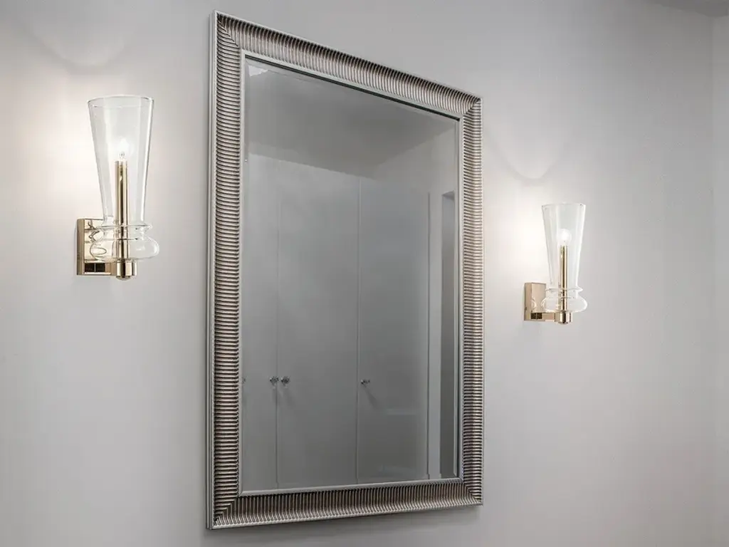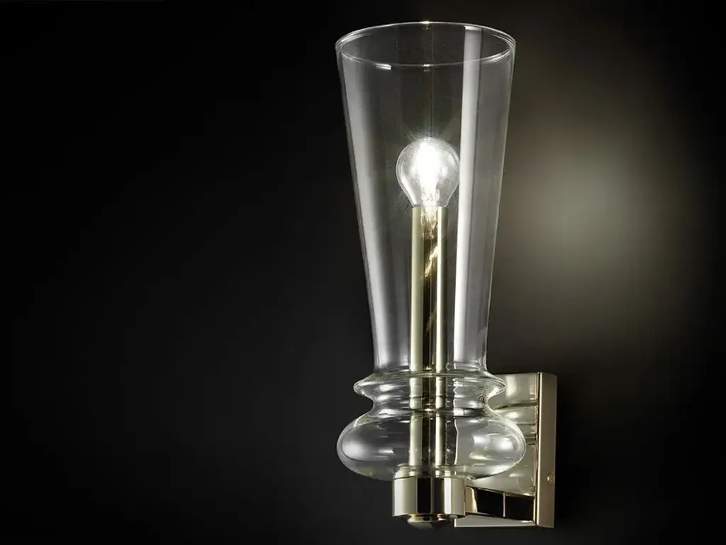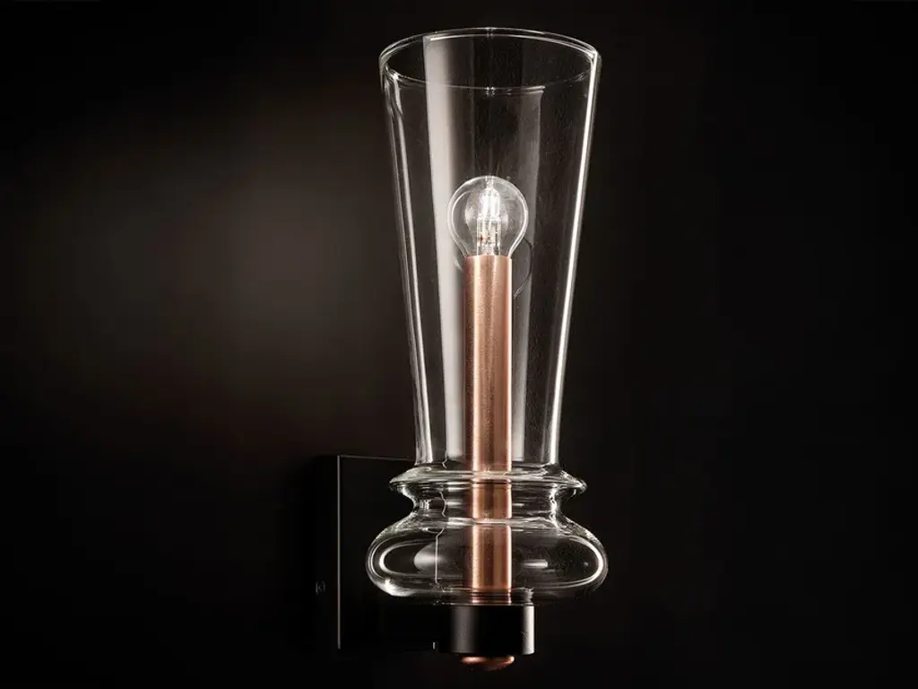 Licio is a wall lamp characterised by elegant and versatile design, able to adapt itself to different interiors, composed of a diffuser in transparent blown glass, shaped like an inverted cone, that protects the interior structure that is paired with a candle, finished in light gold or matt black/brushed copper. Finally, the blown glass diffuser.Electrical and technical characteristicsLED: 1x6w - E14 (dimmable with TRIAC, and on request with Casambi bluetooth)Fuorescent lamp (Energy saving): 1x8w - E14 (not dimmable)Voltage: 230 VEnergy class: A>A++IP20Certifications: CE/EAC/UL