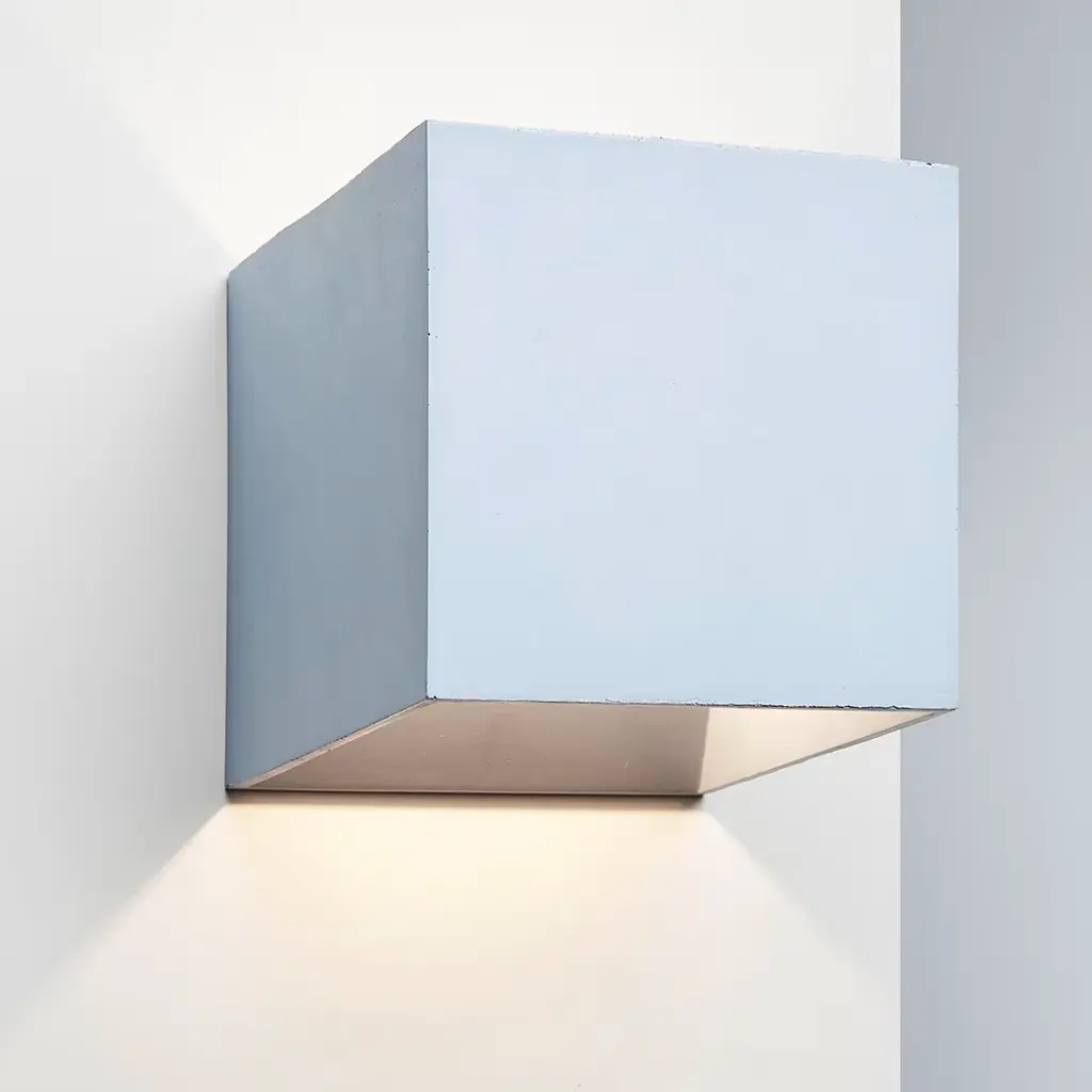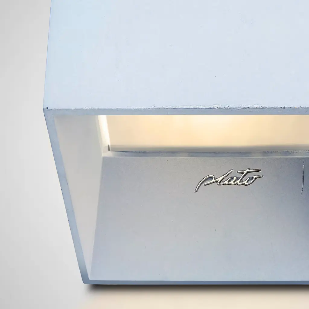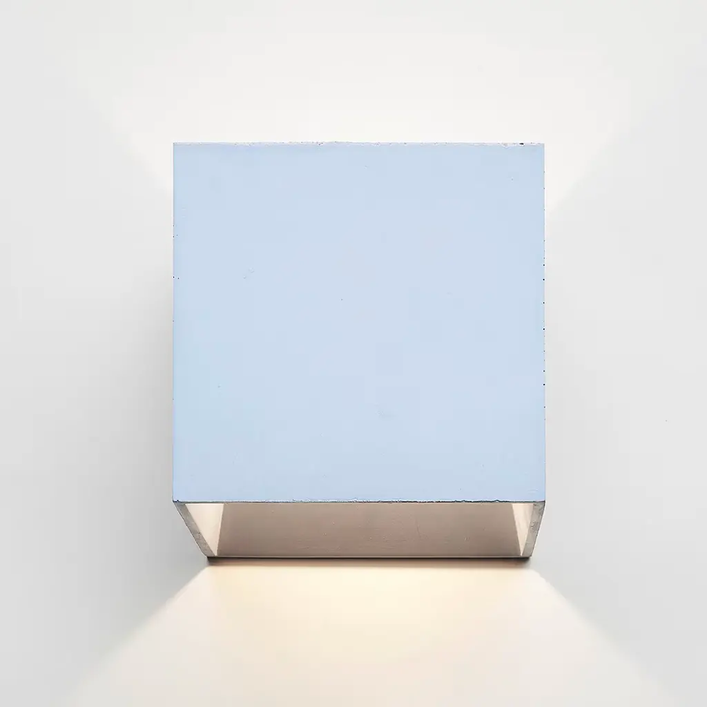 This elegant and minimalist sconce is part of a collection handcrafted of ultra thin concrete in Plato's workshop in Rome. The rigorous cubic shape is tinted in a delicate light blue color that will fit a modern, pastel-palette children's bedroom, bathroom or study. Flanking an entryway mirror or a contemporary bed, this piece will set a sophisticated tone, with its acrylic glass bottom diffusing a soft light. Hardwired and weighing 1.1 kg, this piece is suitable only for interiors. G9 max 10W LED light bulb not included.