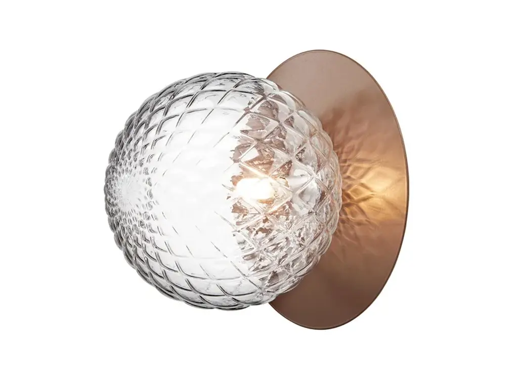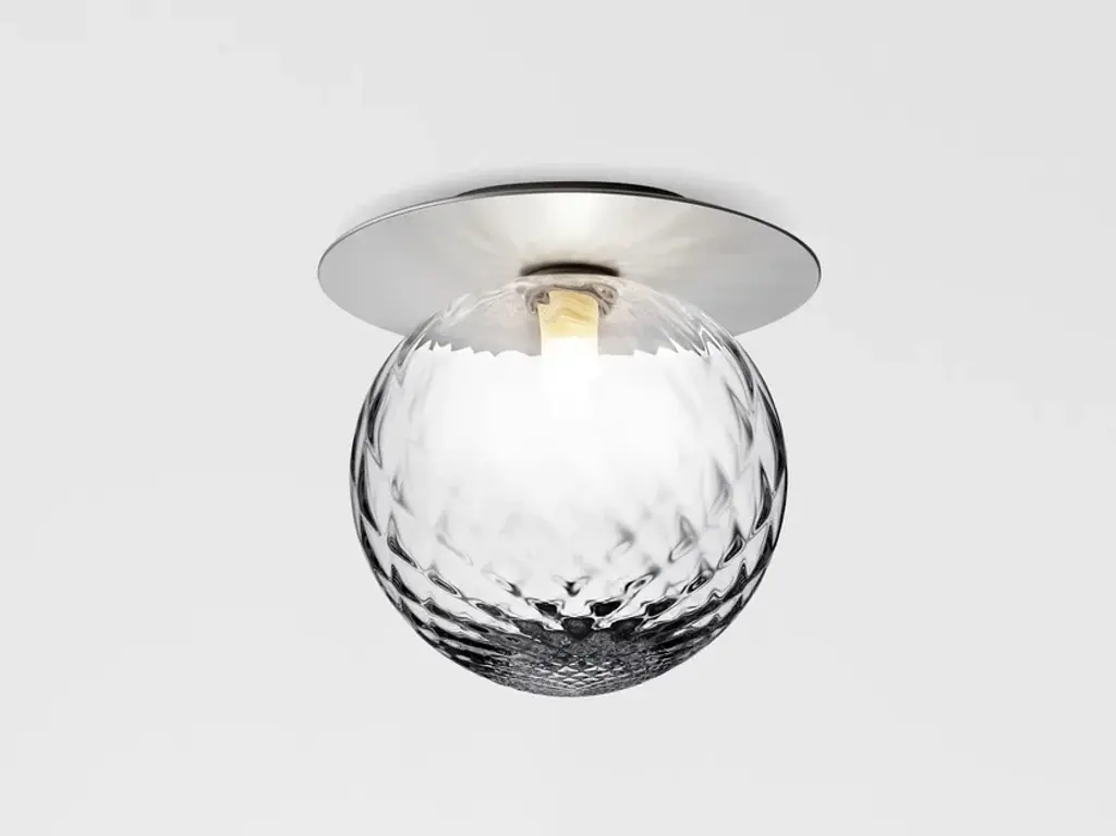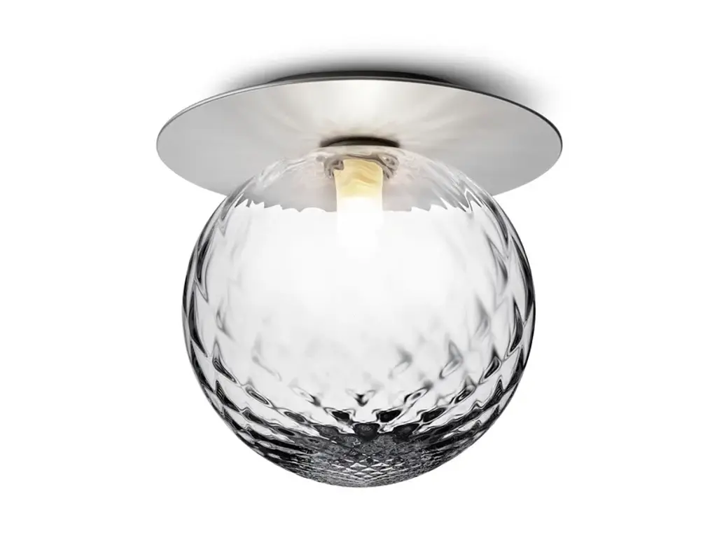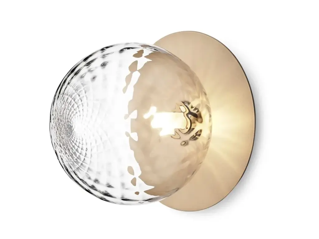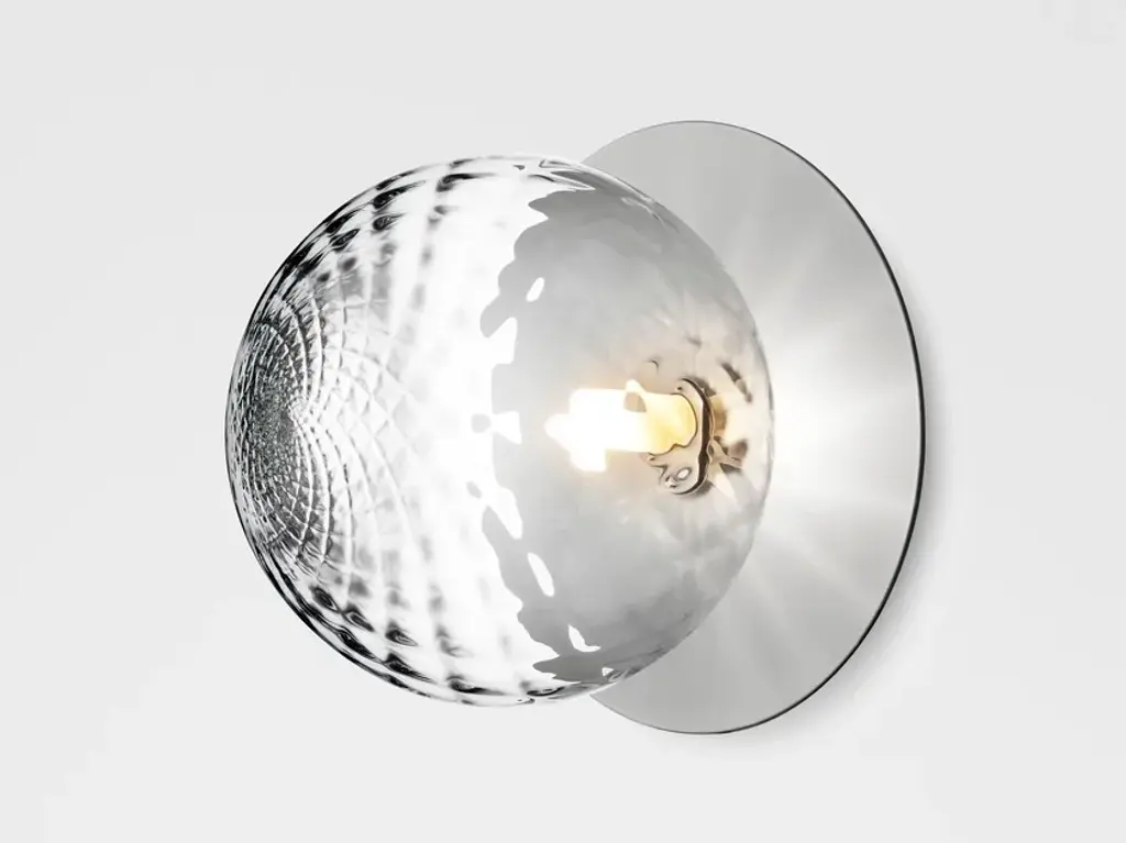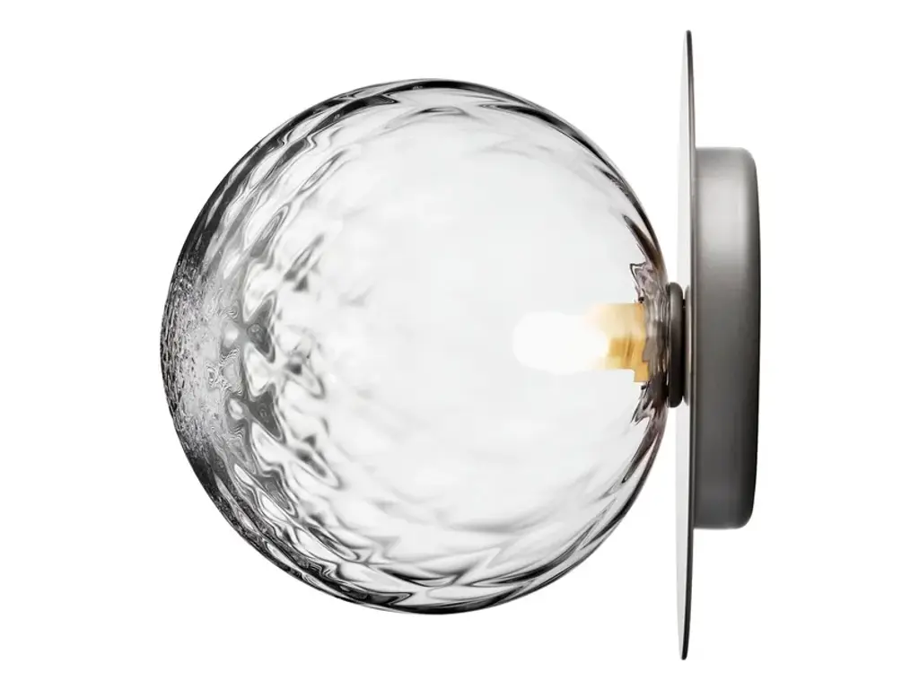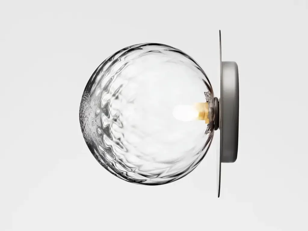 Liila 1 is a single lamp, which looks beautiful on the wall or ceiling. It is simple in its form, consisting of a thin round sheet of metal and a unique, mouth-blown glass sphere. Liila 1 Large Optic Wall/Ceiling works perfectly single or grouped in a decorative formation. Liila 1 also suits smaller rooms, the bathroom and the entrance hall.The Liila collection has a playful approach to light and how wall lighting is usually conceived. Liila is a sculpture for the wall from where it spreads an extravagant atmosphere through its mouth-blown glass. The clear optic glass gives a defined light, creating radiant reflections like the rays of the sun, while the opal white glass gives a soft, diffused light like a Nordic midnight sun. The collection consists of single wall and ceiling lamps and a chandelier for the wall which can be customised.