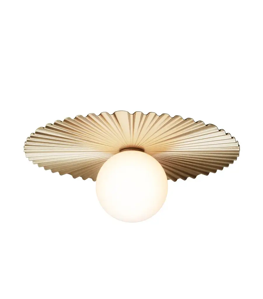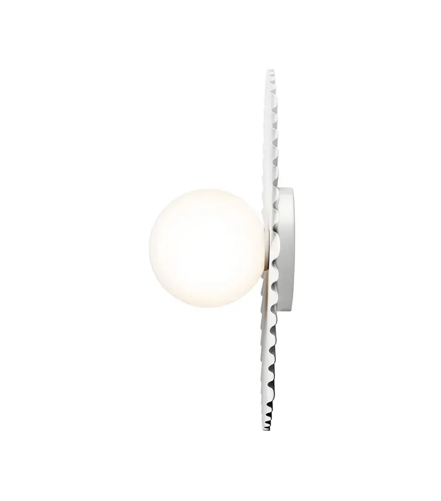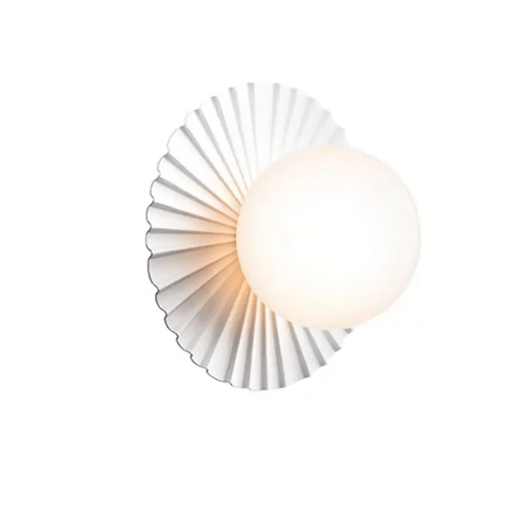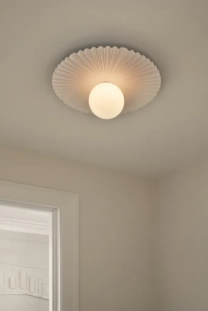 Liila Muuse is a wall and ceiling light with a playful expression. The lamp consists of a round backplate in metal finish which complements the opal white glass. The organic shape and rifled structure create decorative light and shadow reflections when the light is on. Liila Muuse Small can illuminate a hallway, and the IP44 rating makes the wall lamp approved for installation in the bathroom as well.The Liila Muuse Medium lamp is ideal as a semi-flush mount ceiling light in a foyer, adding an interesting expression to the room.Light source: Socket: G9Max wattage: 7W LEDVoltage (V): 220-240V / 120VLight sources not includedDimmable if installed with appropriate dimmable LEDlight source(s) suitable for your dimmer circuit. The Liila collection has a playful approach to light and how wall lighting is usually conceived. Liila is a sculpture for the wall from where it spreads an extravagant atmosphere through its mouth-blown glass. The clear optic glass gives a defined light, creating radiant reflections like the rays of the sun, while the opal white glass gives a soft, diffused light like a Nordic midnight sun. The collection consists of single wall and ceiling lamps and a chandelier for the wall which can be customised.